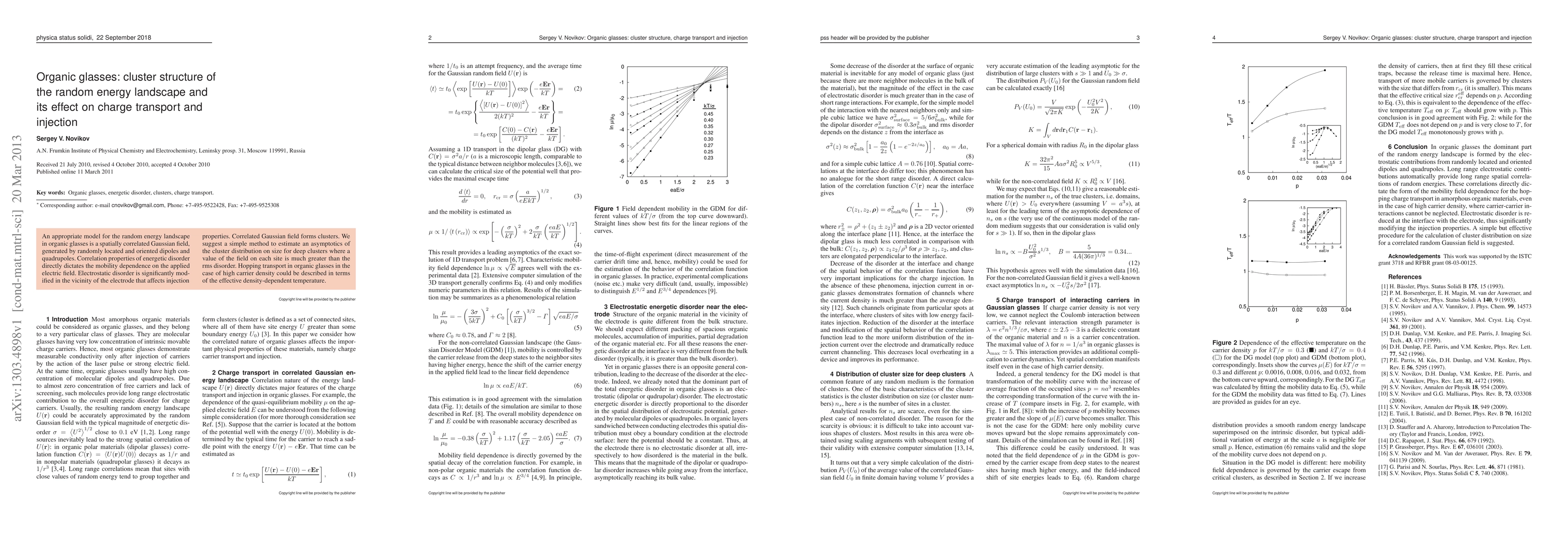 This paper proposes a spatially correlated Gaussian field model to describe the random energy landscape in organic glasses, emphasizing its impact on charge transport and injection. It suggests that correlated Gaussian field clusters affect mobility and injection properties, and proposes a method to estimate the cluster distribution size for deep clusters.