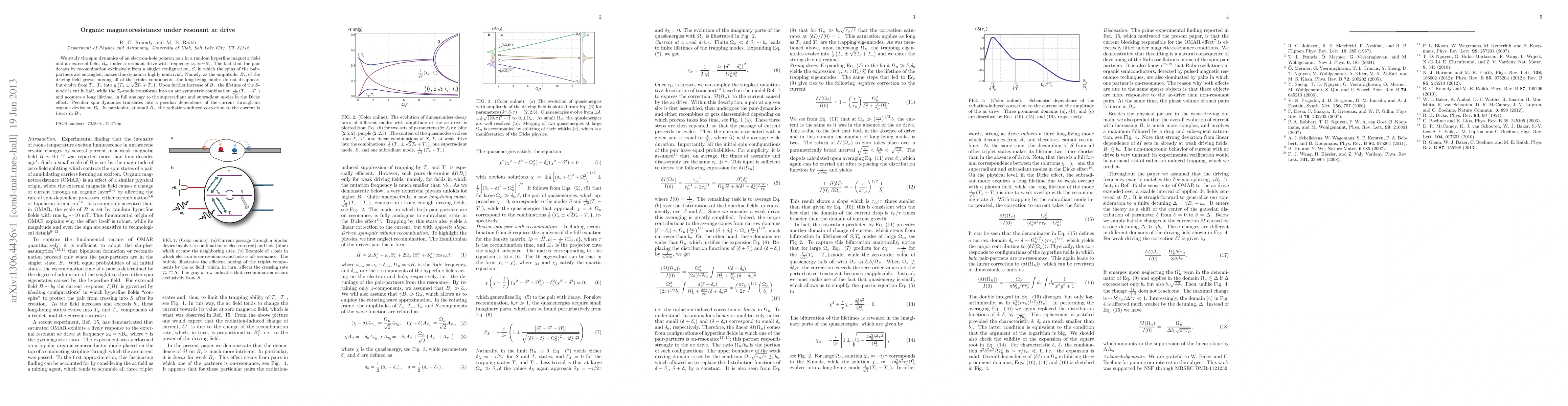 We study the spin dynamics of an electron-hole pair in a random hyperfine magnetic field and an external field, B0, under a resonant drive with frequency omega0 = gamma B0. The fact that the pair decays by recombination exclusively from a singlet configuration, S, in which the spins of the pair-partners are entangled, makes this dynamics highly nontivial. Namely, as the amplitude, B1, of the driving field grows, mixing all of the triplet components, the long-living modes do not disappear, but evolve from T+, T- into (T+ +/- sqrt(2) T0 + T-)/2. Upon further increase of B1, the lifetime of the S-mode is cut in half, while the T0-mode transforms into an antisymmetric combination (T- - T-)/sqrt(2) and acquires a long lifetime, in full analogy to the superradiant and subradiant modes in the Dicke effect. Peculiar spin dynamics translates into a peculiar dependence on B1. In particular, at small B1, the radiation-induced correction to the current is linear in B1.