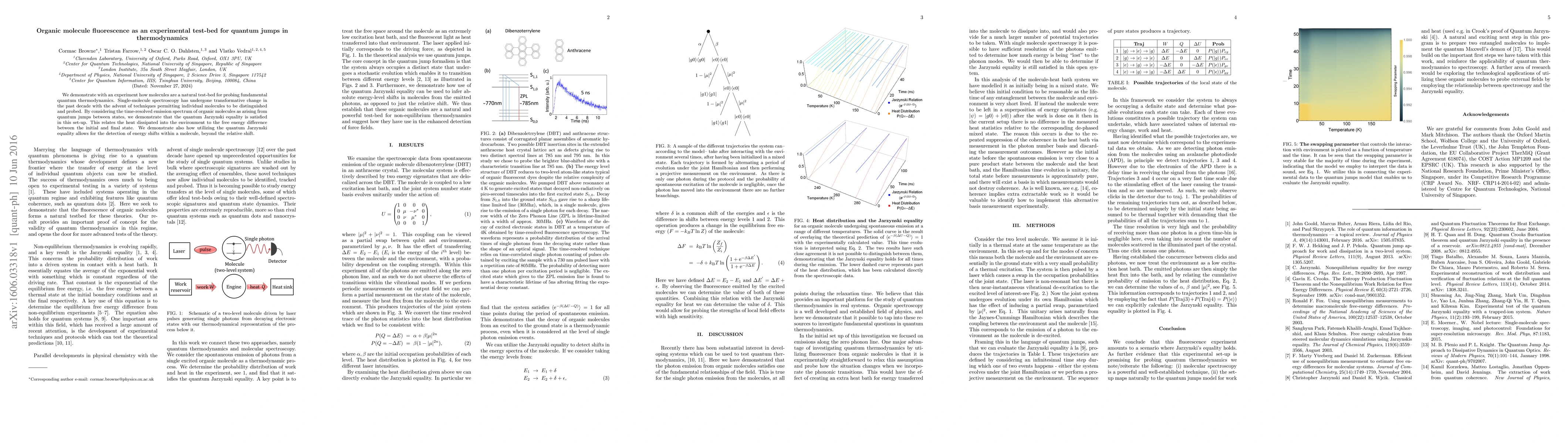 We demonstrate with an experiment how molecules are a natural test-bed for probing fundamental quantum thermodynamics. Single-molecule spectroscopy has undergone transformative change in the past decade with the advent of techniques permitting individual molecules to be distinguished and probed. By considering the time-resolved emission spectrum of organic molecules as arising from quantum jumps between states, we demonstrate that the quantum Jarzynski equality is satisfied in this set-up. This relates the heat dissipated into the environment to the free energy difference between the initial and final state. We demonstrate also how utilizing the quantum Jarzynski equality allows for the detection of energy shifts within a molecule, beyond the relative shift.