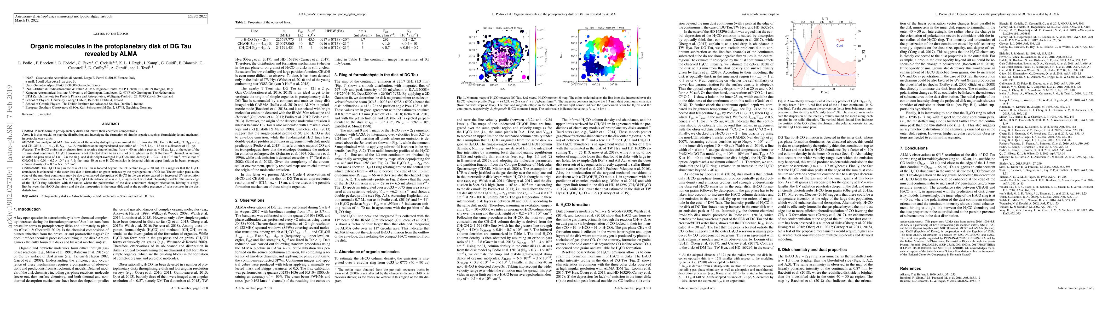 This paper uses ALMA to reveal the distribution of organic molecules like formaldehyde (H$_2$CO) and methanol (CH$_3$OH) in the protoplanetary disk around DG Tau. The H$_2$CO ring is found beyond the CO ice line, suggesting its formation on grain surfaces, while CH$_3$OH is undetected, indicating a CH$_3$OH/H$_2$CO abundance ratio less than 1.