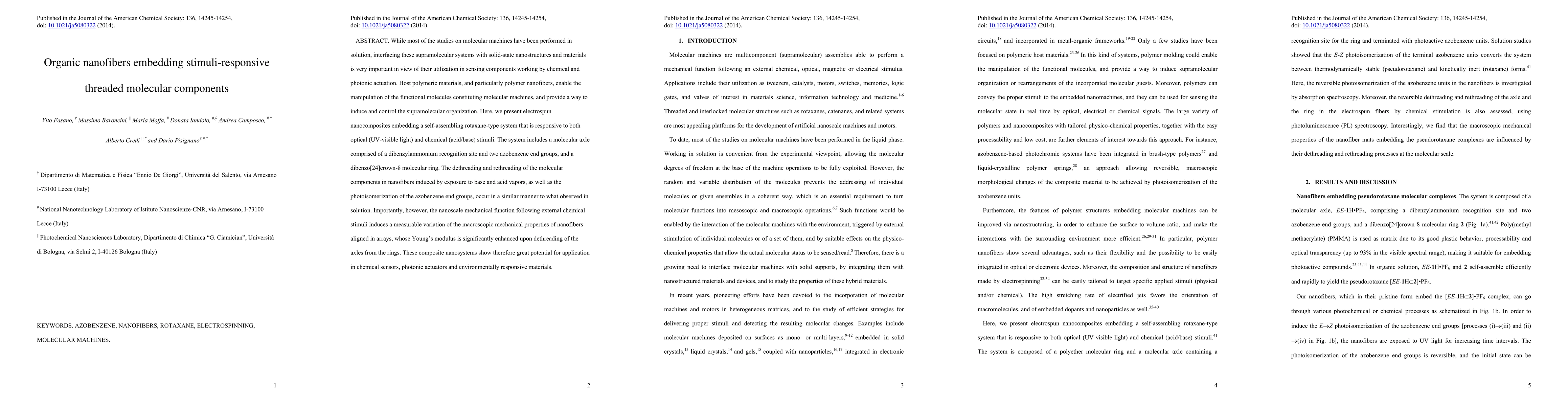 This paper presents electrospun nanocomposites embedding a self-assembling rotaxane system responsive to both optical and chemical stimuli, demonstrating enhanced Young's modulus upon dethreading, indicating potential for chemical sensors and photonic actuators.