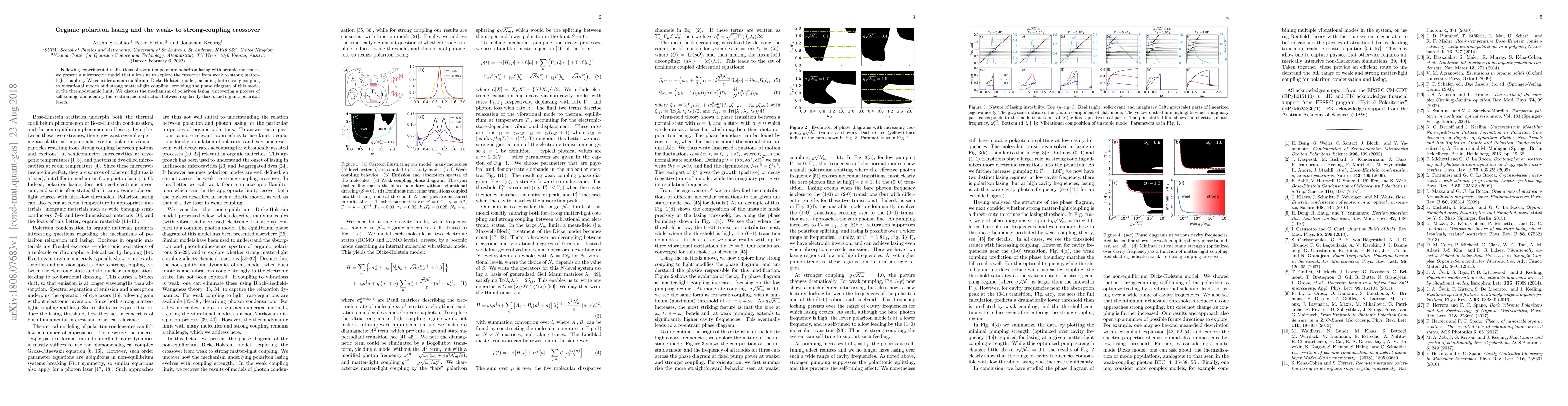 This paper explores the transition from weak to strong matter-light coupling in organic polariton lasing using a non-equilibrium Dicke-Holstein model, revealing the self-tuning mechanism and distinguishing organic polariton lasers from conventional dye lasers. The study provides a phase diagram for this crossover in the thermodynamic limit.