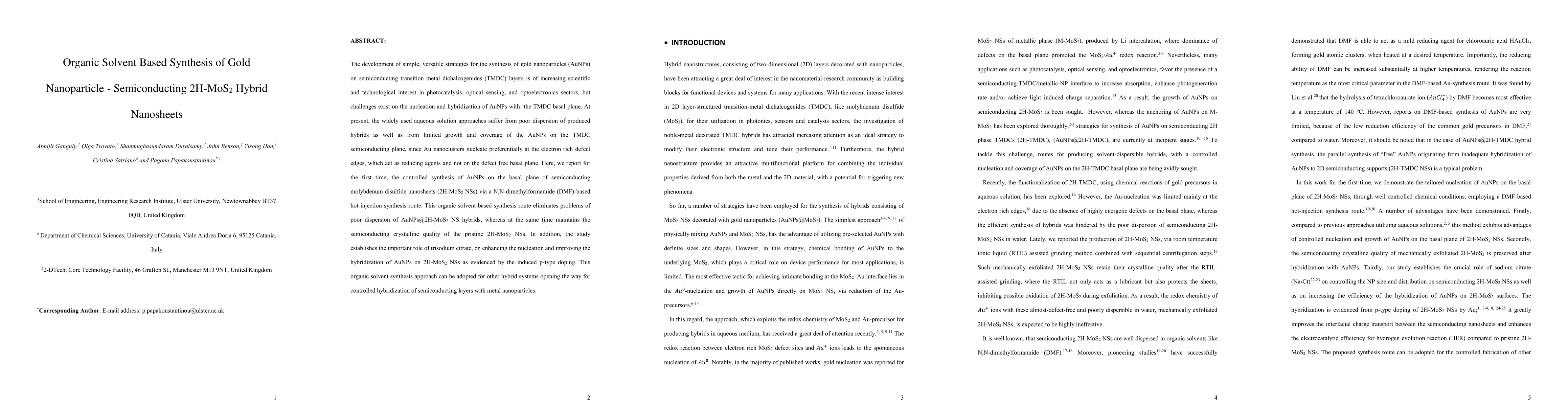 This paper presents a novel organic solvent-based method for the synthesis of gold nanoparticles on semiconducting molybdenum disulfide nanosheets, achieving better dispersion and hybridization compared to aqueous methods. The use of N,N-dimethylformamide and trisodium citrate enhances nucleation and maintains the material's semiconducting properties.