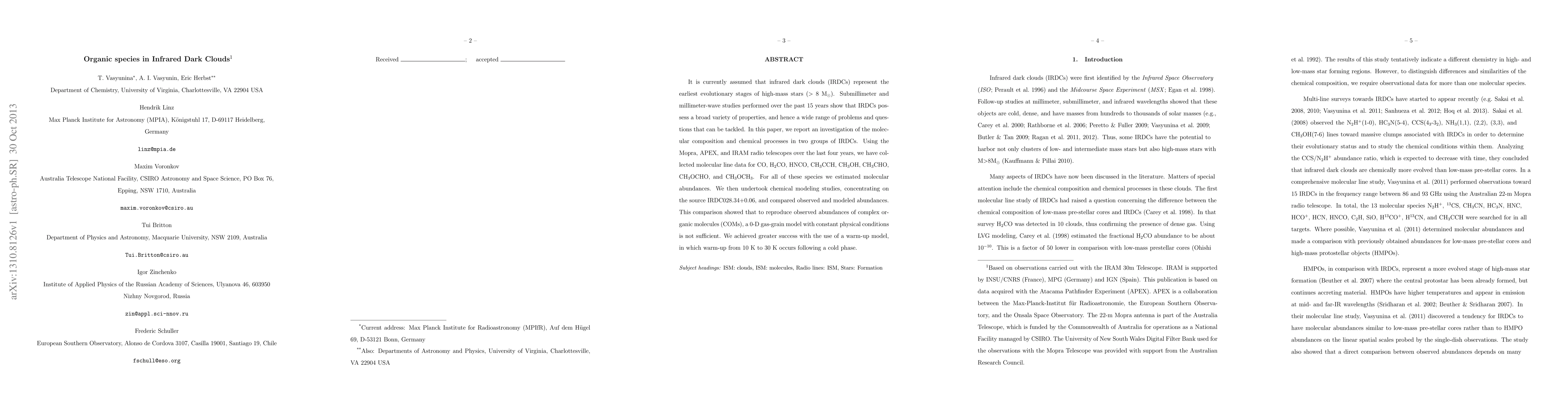 It is currently assumed that infrared dark clouds (IRDCs) represent the earliest evolutionary stages of high-mass stars ($>$ 8 M$_{\odot}$). Submillimeter and millimeter-wave studies performed over the past 15 years show that IRDCs possess a broad variety of properties, and hence a wide range of problems and questions that can be tackled. In this paper, we report an investigation of the molecular composition and chemical processes in two groups of IRDCs. Using the Mopra, APEX, and IRAM radio telescopes over the last four years, we have collected molecular line data for CO, H$_2$CO, HNCO, CH$_3$CCH, CH$_3$OH, CH$_3$CHO, CH$_3$OCHO, and CH$_3$OCH$_3$. For all of these species we estimated molecular abundances. We then undertook chemical modeling studies, concentrating on the source IRDC028.34+0.06, and compared observed and modeled abundances. This comparison showed that to reproduce observed abundances of complex organic molecules (COMs), a 0-D gas-grain model with constant physical conditions is not sufficient. We achieved greater success with the use of a warm-up model, in which warm-up from 10 K to 30 K occurs following a cold phase.