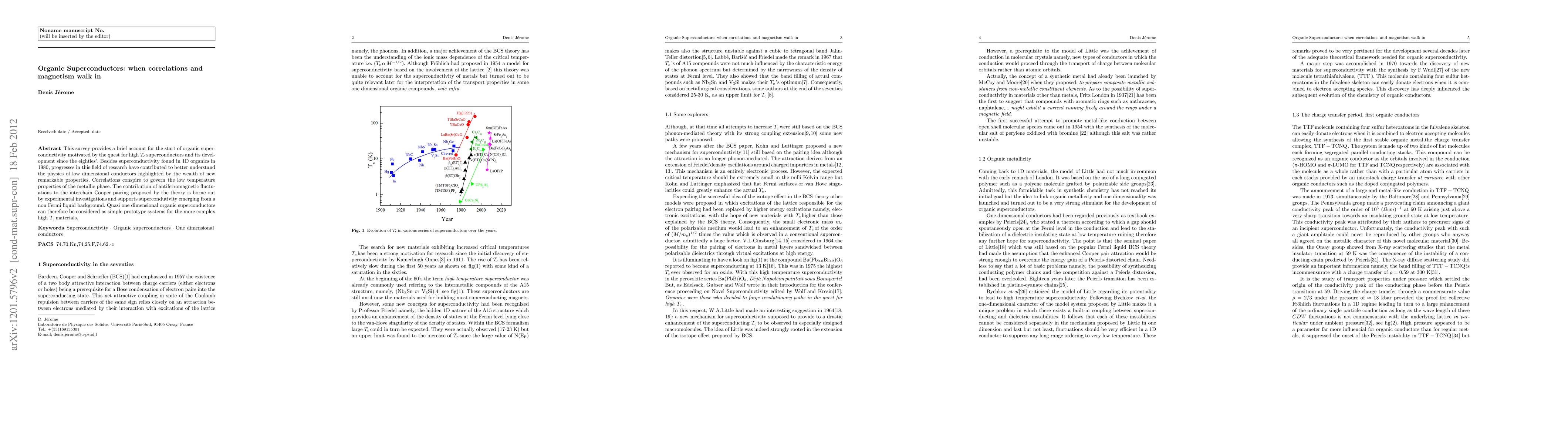 This paper reviews the emergence and development of organic superconductivity, emphasizing its unique properties and the role of correlations and magnetism in governing the metallic phase. Experimental findings support the theory that antiferromagnetic fluctuations contribute to interchain Cooper pairing, positioning quasi one-dimensional organic superconductors as fundamental models for high Tc materials.