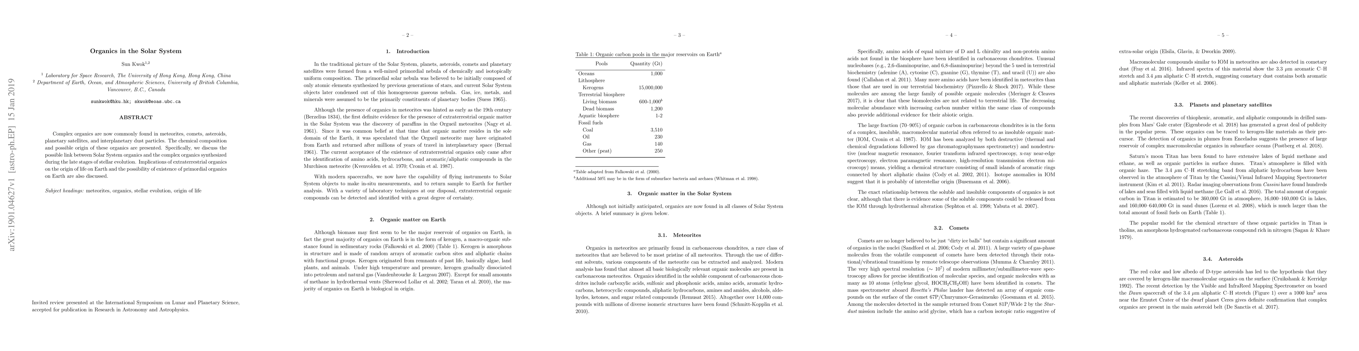 This paper explores the presence of complex organics in various solar system bodies and their potential origins, linking them to late-stage stellar evolution. It also examines the implications for the origin of life on Earth and the possibility of primordial organics existing on our planet.