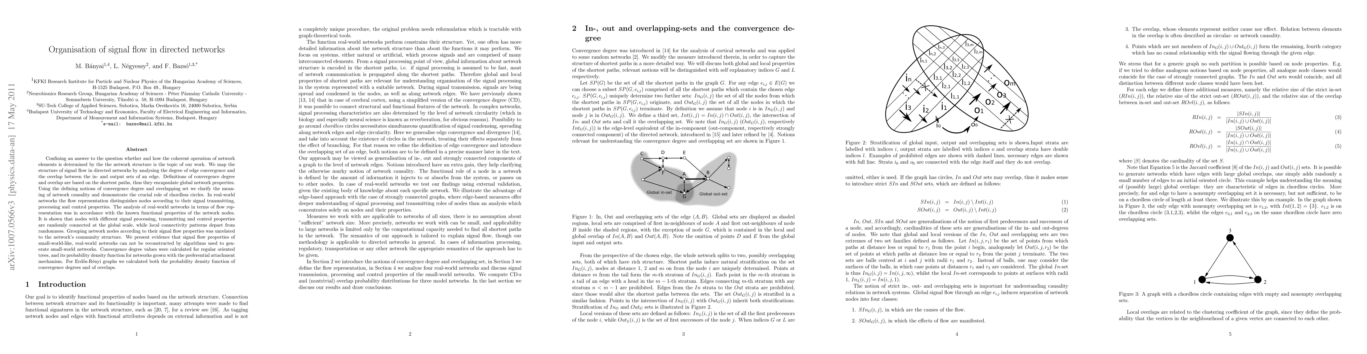 Confining an answer to the question whether and how the coherent operation of network elements is determined by the the network structure is the topic of our work. We map the structure of signal flow in directed networks by analysing the degree of edge convergence and the overlap between the in- and output sets of an edge. Definitions of convergence degree and overlap are based on the shortest paths, thus they encapsulate global network properties. Using the defining notions of convergence degree and overlapping set we clarify the meaning of network causality and demonstrate the crucial role of chordless circles. In real-world networks the flow representation distinguishes nodes according to their signal transmitting, processing and control properties. The analysis of real-world networks in terms of flow representation was in accordance with the known functional properties of the network nodes. It is shown that nodes with different signal processing, transmitting and control properties are randomly connected at the global scale, while local connectivity patterns depart from randomness. Grouping network nodes according to their signal flow properties was unrelated to the network's community structure. We present evidence that signal flow properties of small-world-like, real-world networks can not be reconstructed by algorithms used to generate small-world networks. Convergence degree values were calculated for regular oriented trees, and its probability density function for networks grown with the preferential attachment mechanism. For Erd\H{o}s-R\'enyi graphs we calculated both the probability density function of convergence degrees and of overlaps.