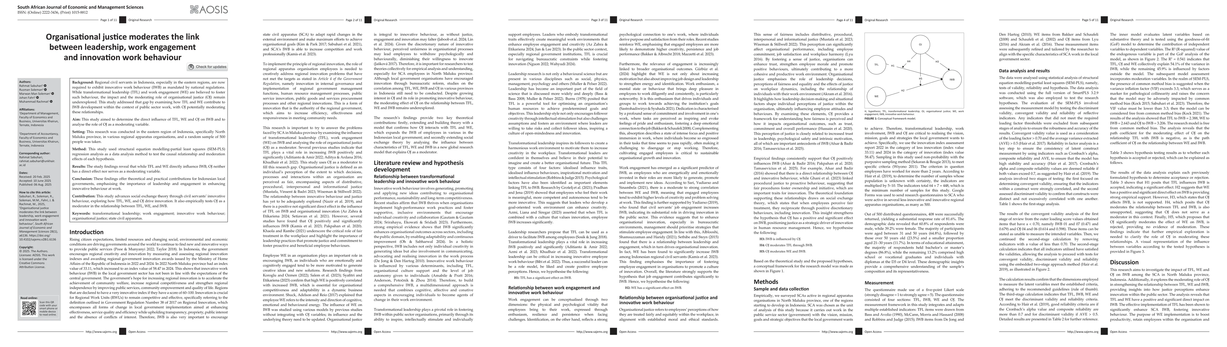 Regional civil servants in Indonesia, especially in the eastern regions, are now required to exhibit innovative work behavior (IWB) as mandated by national regulations. While transformational leadership (TFL) and work engagement (WE) are believed to foster such behavior, the impact and the moderating role of organizational justice (OJ) remain underexplored. This study addresses that gap by examining how TFL and WE contribute to IWB development within the context of public sector work, with OJ potentially moderating these relationships. This study aimed to determine the direct influence of TFL, WE, and OJ on IWB and to analyze the role of OJ as a moderating variable. This research was conducted in the eastern region of Indonesia, especially North Maluku Province, in various regional apparatus organizations. and a random sample of 500 people was taken. This study used Structural Equation Modeling-Partial Least Squares (SEM-PLS) regression analysis as a data analysis method to test the causal relationship and moderation effects of each hypothesis. The study findings reveal that while TFL and WE directly influence IWB, OJ neither has a direct effect nor serves as a moderating variable. These findings offer theoretical and practical contributions to local government organizations in Indonesia, emphasizing the importance of leadership and engagement in enhancing innovative behavior at work. This study extends and enhances the development of social exchange theory based on civil servants' IWB. Furthermore, this study expands the theoretical perspective by examining how TFL, WE, and OJ influence innovative work behavior practices to improve employee innovative behaviour. Finally, this study empirically examines the moderating impact of organizational justice on the relationship between TFL and WE on IWB.