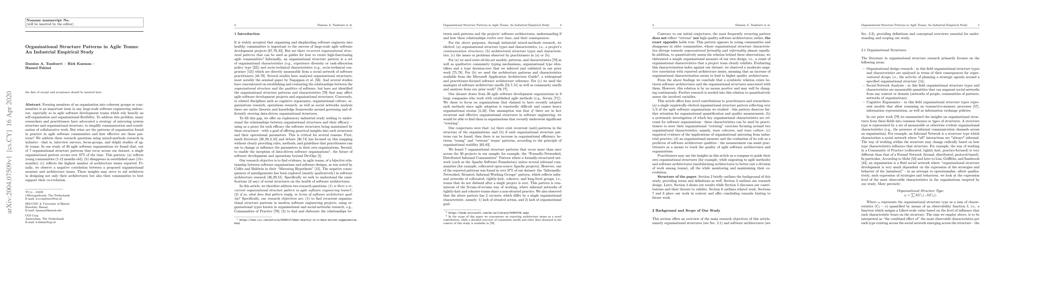 This study investigates organisational structure patterns in agile software development teams through mixed-methods research, revealing that a single pattern emerges in young communities (1-12 months) but diminishes in established ones, correlating with higher architecture issues. These findings suggest that organisational structure can impact architectural challenges.