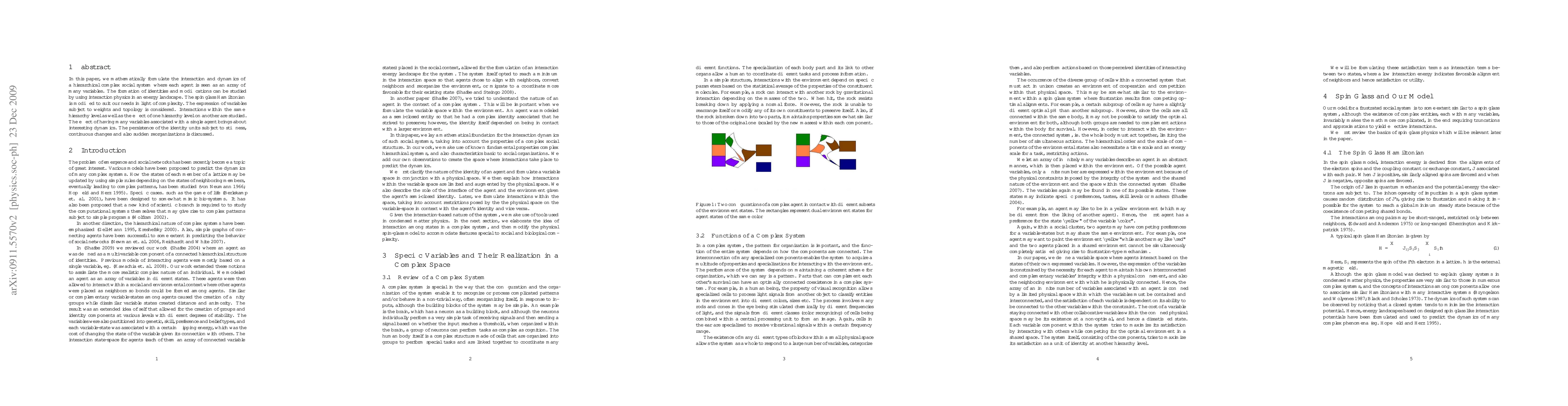In this paper, we mathematically formulate the interaction and dynamics of a hierarchical complex social system where each agent is seen as an array of many variables. The formation of identities and modifications can be studied by using interaction physics in an energy landscape. The spin glass Hamiltonian is modified to suit our needs in light of complexity. The expression of variables subject to weights and topology is considered. Interactions within the same hierarchy level as well as the effect of one hierarchy level on another are studied. The effect of having many variables associated with a single agent brings about interesting dynamics. The persistence of the identity units subject to stiffness, continuous changes and also sudden reorganizations is discussed.