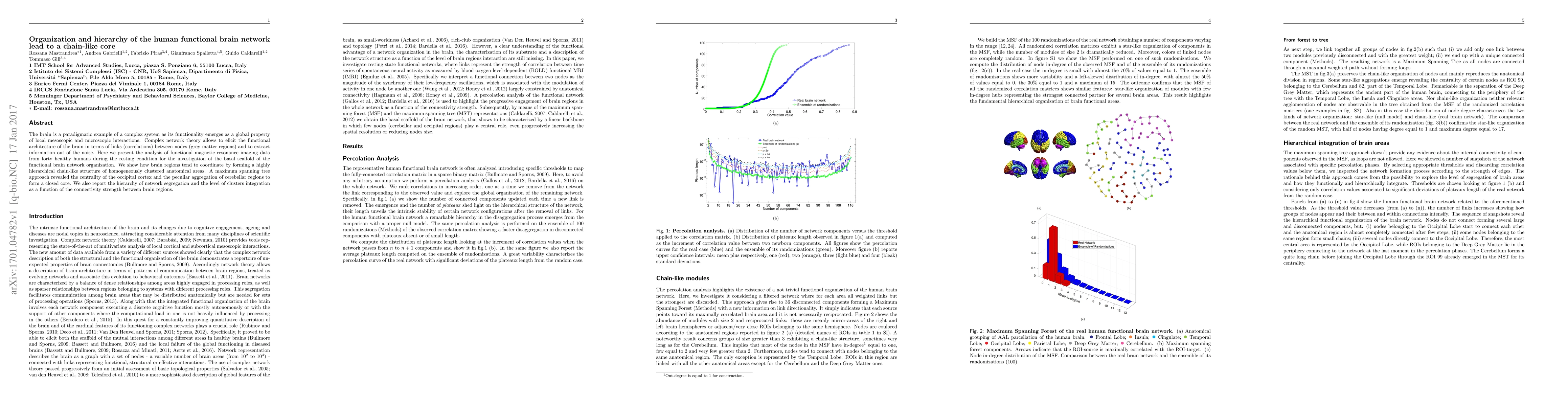 The brain is a paradigmatic example of a complex system as its functionality emerges as a global property of local mesoscopic and microscopic interactions. Complex network theory allows to elicit the functional architecture of the brain in terms of links (correlations) between nodes (grey matter regions) and to extract information out of the noise. Here we present the analysis of functional magnetic resonance imaging data from forty healthy humans during the resting condition for the investigation of the basal scaffold of the functional brain network organization. We show how brain regions tend to coordinate by forming a highly hierarchical chain-like structure of homogeneously clustered anatomical areas. A maximum spanning tree approach revealed the centrality of the occipital cortex and the peculiar aggregation of cerebellar regions to form a closed core. We also report the hierarchy of network segregation and the level of clusters integration as a function of the connectivity strength between brain regions.