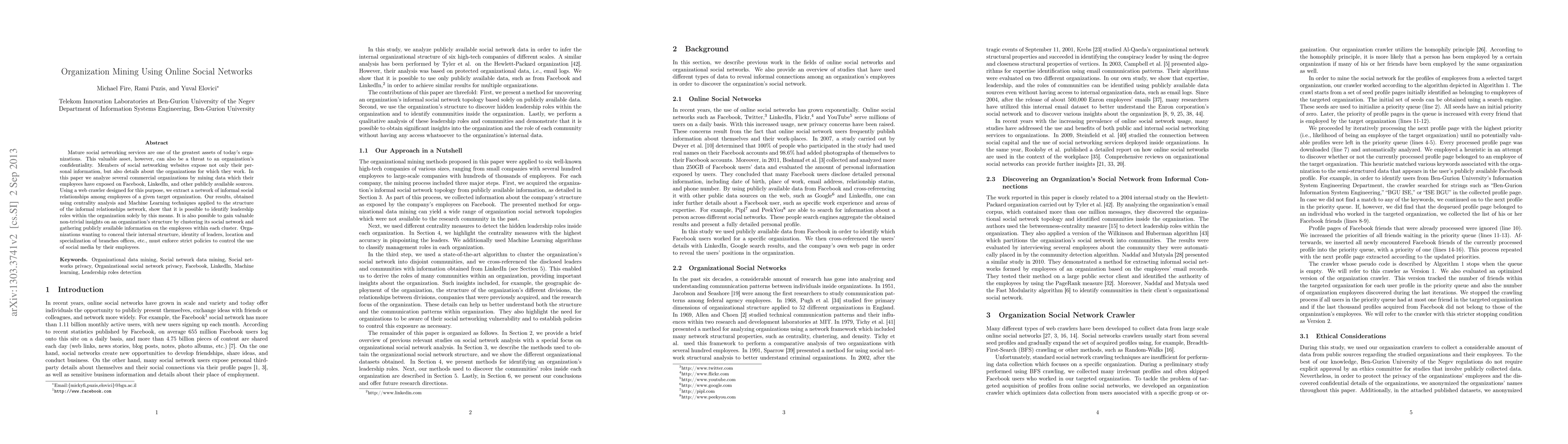 This paper explores how data from online social networks can be mined to reveal organizational structures and leadership roles, highlighting the potential risks to confidentiality and suggesting the need for strict social media policies to protect internal information. The study uses web crawling and machine learning to analyze employee-exposed data on platforms like Facebook and LinkedIn.