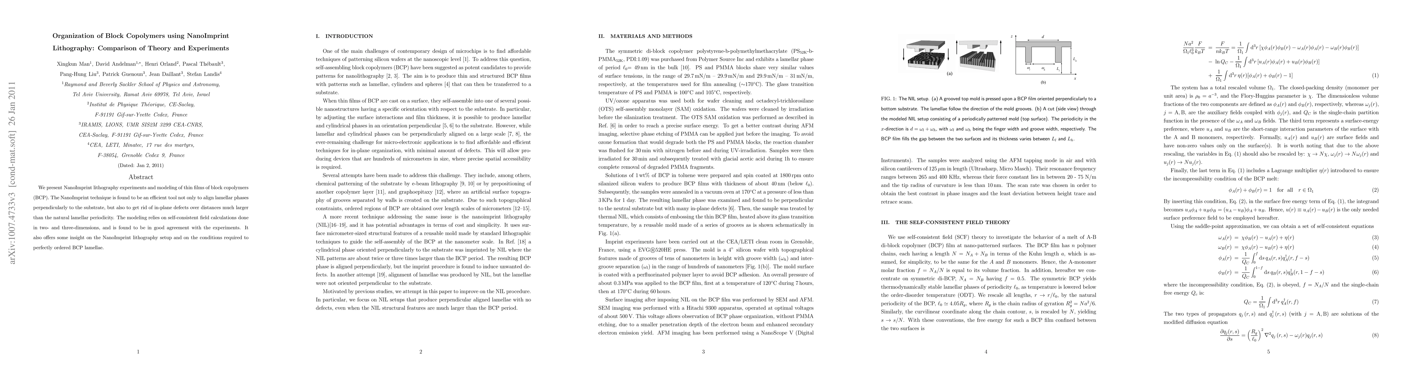 This paper compares NanoImprint lithography experiments and theoretical modeling of block copolymer thin films, demonstrating that aligned lamellar phases can be achieved over large areas, significantly better than on planar surfaces, with good agreement between theory and experimental results.