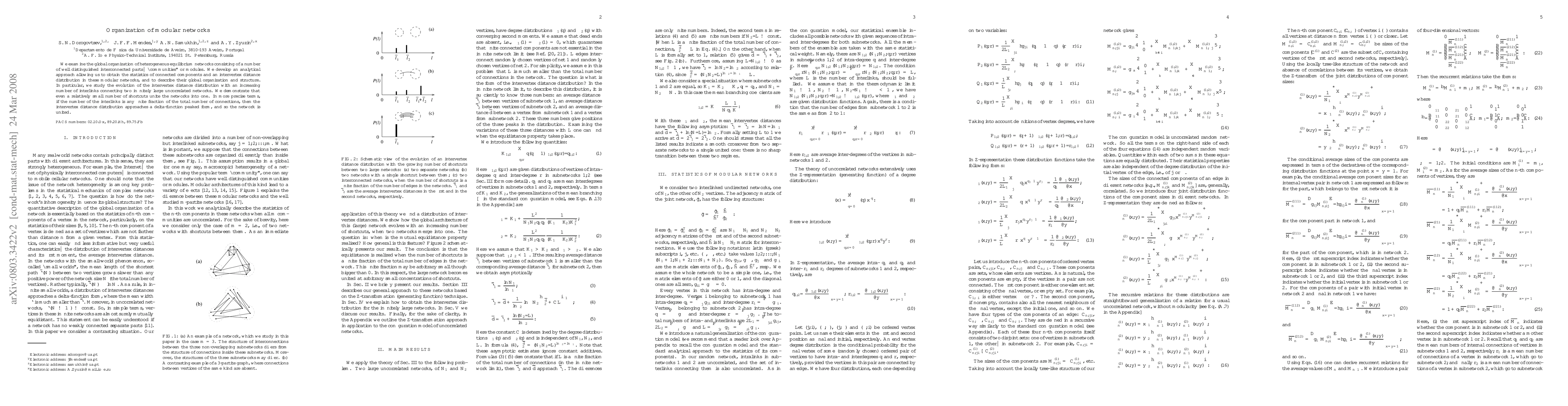 We examine the global organization of heterogeneous equilibrium networks consisting of a number of well distinguished interconnected parts--``communities'' or modules. We develop an analytical approach allowing us to obtain the statistics of connected components and an intervertex distance distribution in these modular networks, and to describe their global organization and structure. In particular, we study the evolution of the intervertex distance distribution with an increasing number of interlinks connecting two infinitely large uncorrelated networks. We demonstrate that even a relatively small number of shortcuts unite the networks into one. In more precise terms, if the number of the interlinks is any finite fraction of the total number of connections, then the intervertex distance distribution approaches a delta-function peaked form, and so the network is united.