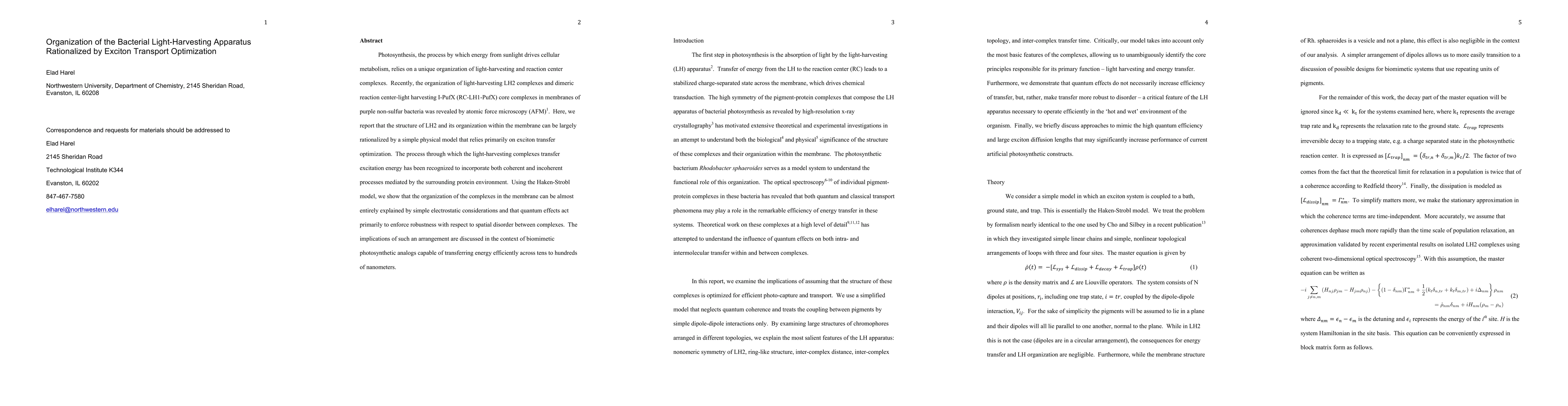 This paper demonstrates that the organization of bacterial light-harvesting complexes (LH2) in membranes can be primarily explained by optimizing exciton transport, with quantum effects enhancing robustness against spatial disorder. The study uses the Haken-Strobl model to show that electrostatic considerations largely dictate the arrangement, with implications for developing efficient biomimetic photosynthetic systems.