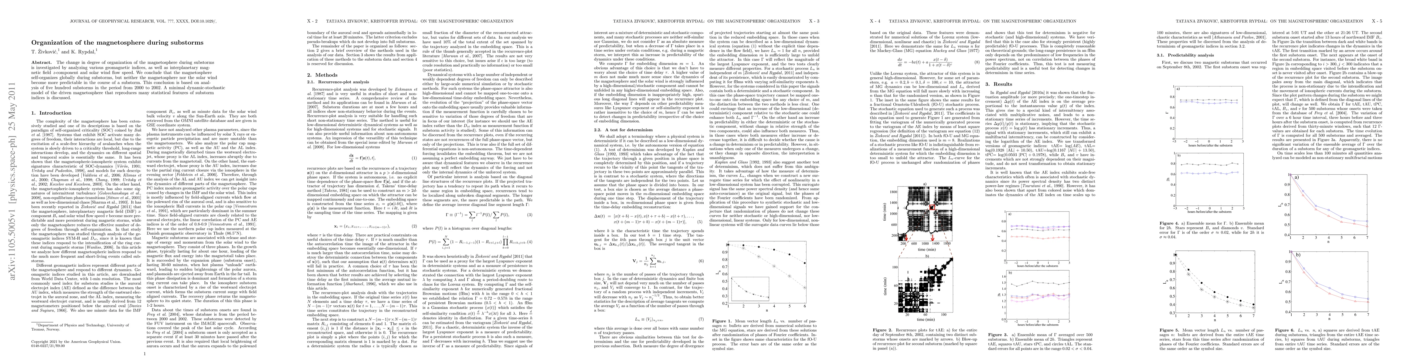 The change in degree of organization of the magnetosphere during substorms is investigated by analyzing various geomagnetic indices, as well as interplanetary magnetic field z-component and solar wind flow speed. We conclude that the magnetosphere self-organizes globally during substorms, but neither the magnetosphere nor the solar wind become more predictable in the course of a substorm. This conclusion is based on analysis of five hundred substorms in the period from 2000 to 2002. A minimal dynamic-stochastic model of the driven magnetosphere that reproduces many statistical features of substorm indices is discussed.