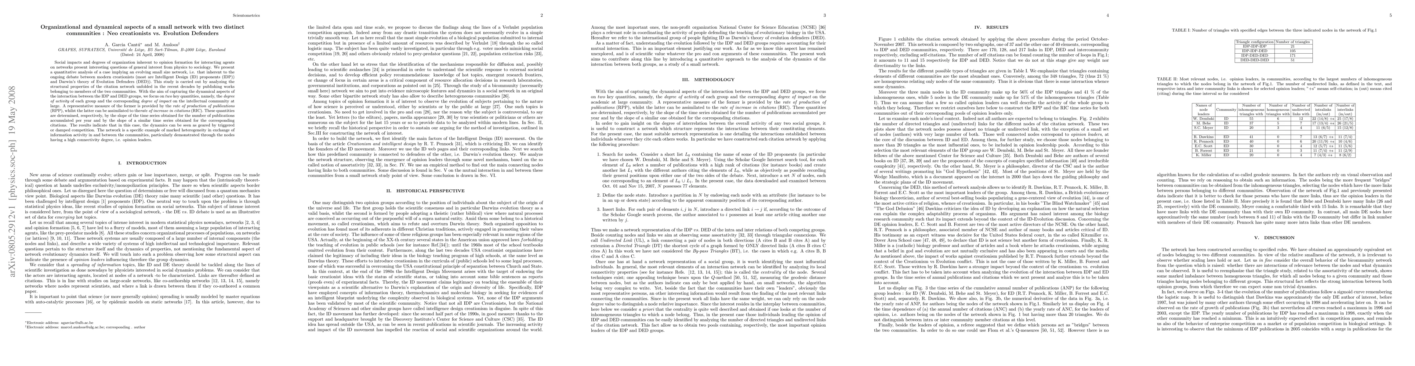 Social impacts and degrees of organization inherent to opinion formation for interacting agents on networks present interesting questions of general interest from physics to sociology. We present a quantitative analysis of a case implying an evolving small size network, i.e. that inherent to the ongoing debate between modern creationists (most are Intelligent Design (ID) proponents (IDP)) and Darwin's theory of Evolution Defenders (DED)). This study is carried out by analyzing the structural properties of the citation network unfolded in the recent decades by publishing works belonging to members of the two communities. With the aim of capturing the dynamical aspects of the interaction between the IDP and DED groups, we focus on $two$ key quantities, namely, the {\it degree of activity} of each group and the corresponding {\it degree of impact} on the intellectual community at large. A representative measure of the former is provided by the {\it rate of production of publications} (RPP), whilst the latter can be assimilated to the{\it rate of increase in citations} (RIC). These quantities are determined, respectively, by the slope of the time series obtained for the number of publications accumulated per year and by the slope of a similar time series obtained for the corresponding citations. The results indicate that in this case, the dynamics can be seen as geared by triggered or damped competition. The network is a specific example of marked heterogeneity in exchange of information activity in and between the communities, particularly demonstrated through the nodes having a high connectivity degree, i.e. opinion leaders.