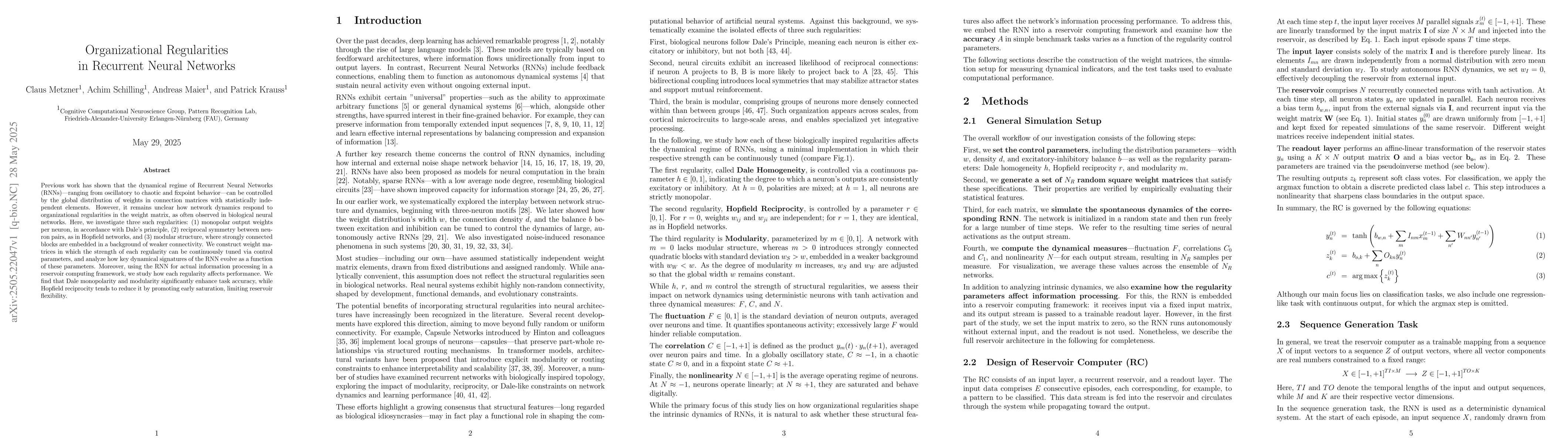 The paper presents a method to systematically study the impact of organizational regularities on RNN dynamics and performance, providing insights into weight matrix design for improved RNN functioning.