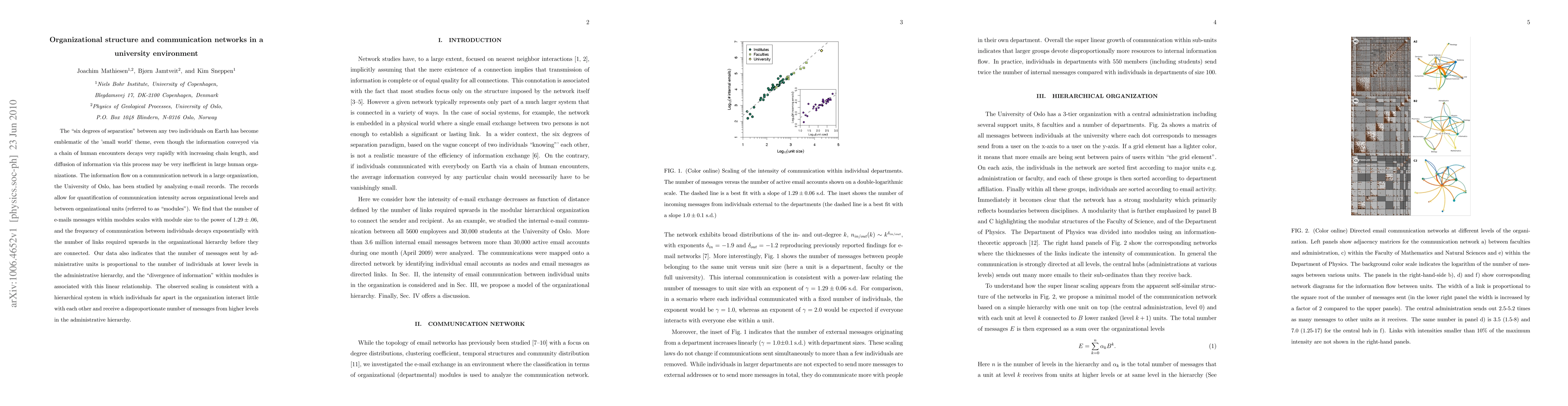 This study analyzes e-mail communication within the University of Oslo to understand information flow and organizational structure. It finds that communication intensity within organizational units scales with unit size, while inter-unit communication decays exponentially with hierarchical distance, indicating a hierarchical system where lower-level individuals receive more messages from higher levels.