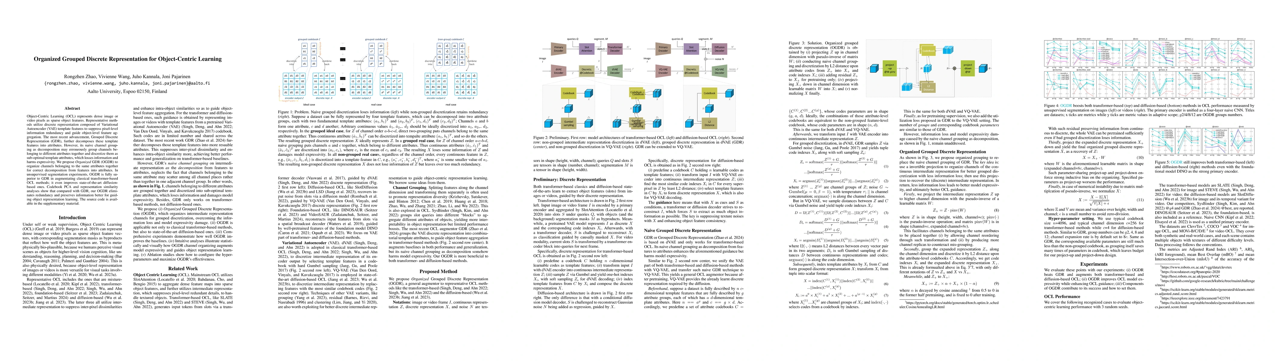 The paper proposes Organized Grouped Discrete Representation (OGDR) to enhance Object-Centric Learning (OCL) by organizing channels of template features into attributes for better decomposition, improving both unsupervised segmentation and representation learning over existing Grouped Discrete Representation (GDR) methods. OGDR reduces redundancy and preserves information more effectively, as shown through codebook PCA and representation similarity analyses.