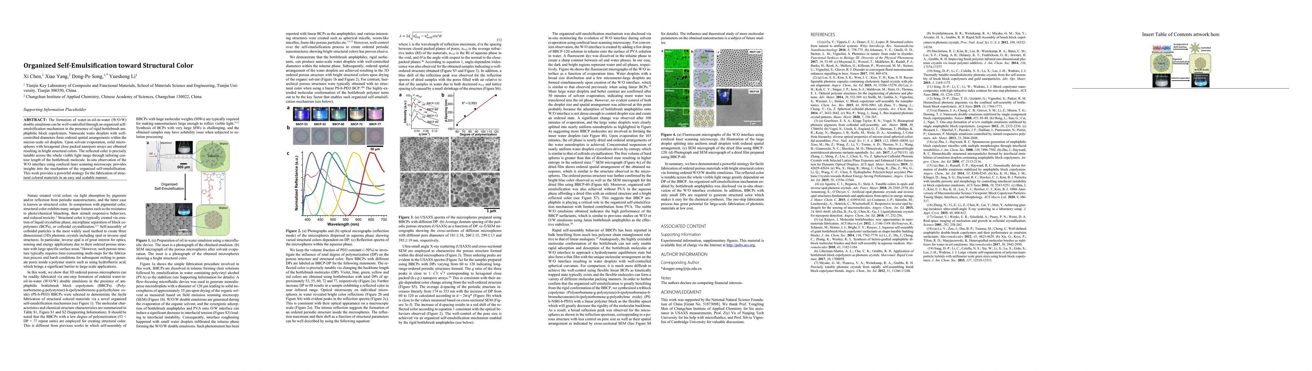 The formation of water-in-oil-in-water (W/O/W) double emulsions can be well-controlled through an organized self-emulsification mechanism in the presence of rigid bottlebrush amphiphilic block copolymers. Nanoscale water droplets with well-controlled diameters form ordered spatial arrangements within the micron-scale oil droplets. Upon solvent evaporation, solid microspheres with hexagonal close packed nanopore arrays are obtained resulting in bright structural colors. The reflected color is precisely tunable across the whole visible light range through tailoring contour length of the bottlebrush molecule. In-situ observation of the W/O interface using confocal laser scanning microscopy provides insights into the mechanism of the organized self-emulsification. This work provides a powerful strategy for the fabrication of structural colored materials in an easy and scalable manner.