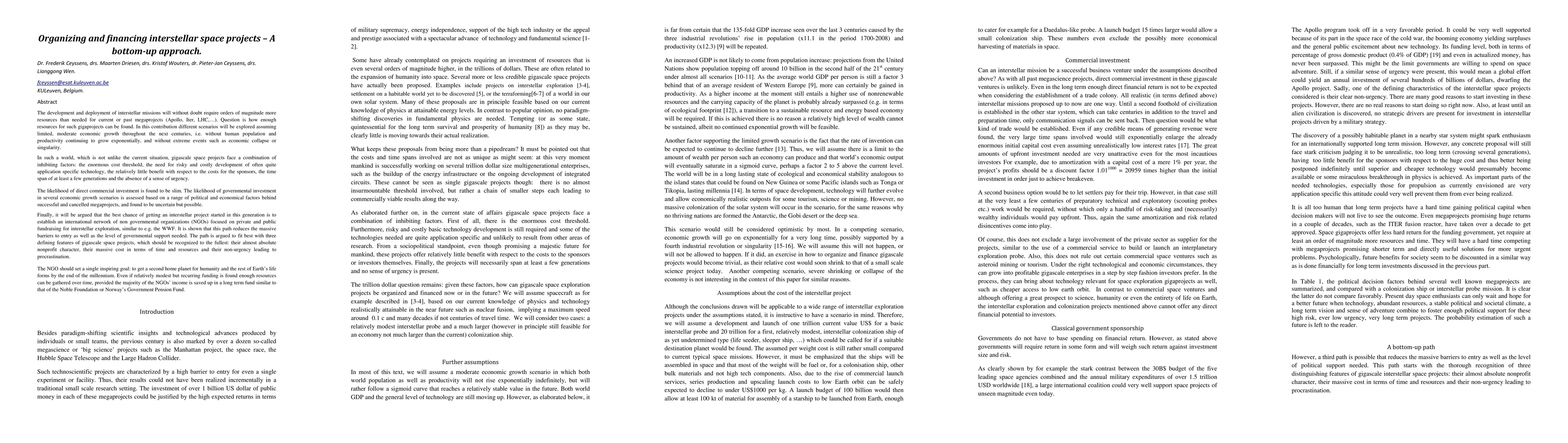 The development and deployment of interstellar missions will without doubt require orders of magnitude more resources than needed for current or past megaprojects (Apollo, Iter, LHC,...). Question is how enough resources for such gigaprojects can be found. In this contribution different scenarios will be explored assuming limited, moderate economic growth throughout the next centuries, i.e. without human population and productivity continuing to grow exponentially, and without extreme events such as economic collapse or singularity. In such a world, which is not unlike the current situation, gigascale space projects face a combination of inhibiting factors: the enormous cost threshold, the need for risky and costly development of often quite application specific technology, the relatively little benefit with respect to the costs for the sponsors, the time span of at least a few generations and the absence of a sense of urgency. It will be argued that the best chance of getting an interstellar project started in this generation is to establish an international network of non governmental organizations (NGOs) focused on private and public fundraising for interstellar exploration, similar to e.g. the WWF. It is shown that this path reduces the massive barriers to entry as well as the level of governmental support needed. The path is argued to fit best with three defining features of gigascale space projects, which should be recognized to the fullest: their almost absolute nonprofit character, their massive cost in terms of time and resources and their non-urgency leading to procrastination. Even if relatively modest but recurring funding is found enough resources can be gathered over time, provided the majority of the NGOs' income is saved up in a long term fund similar to that of the Noble Foundation or Norway's Government Pension Fund.
