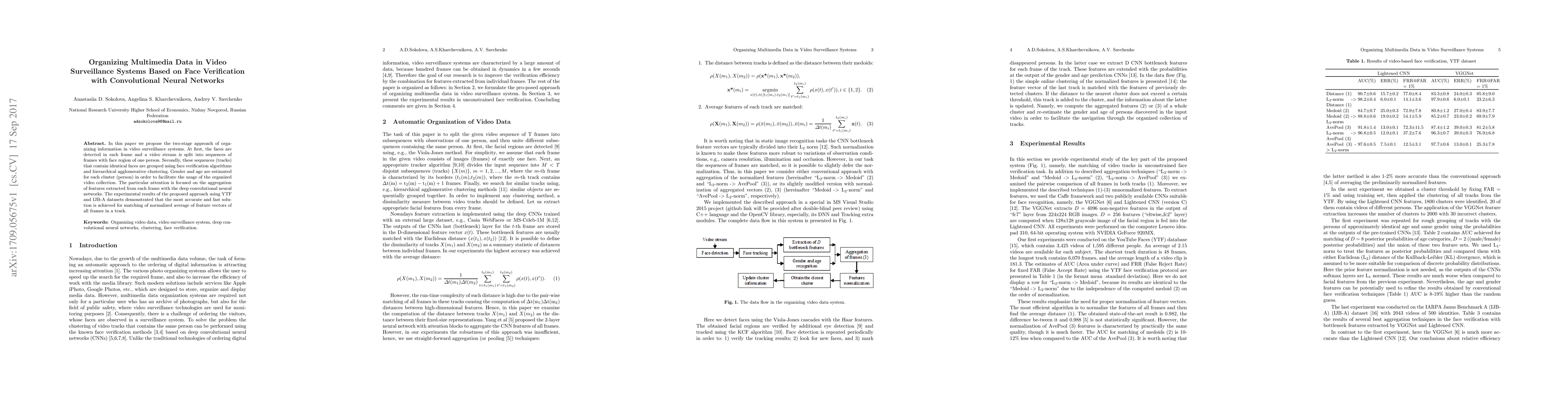 This paper proposes a two-stage method for organizing multimedia data in video surveillance systems using face verification and convolutional neural networks. It detects faces, groups sequences of frames with identical faces, and estimates gender and age for each group, achieving accurate and fast matching using aggregated feature vectors from deep learning.