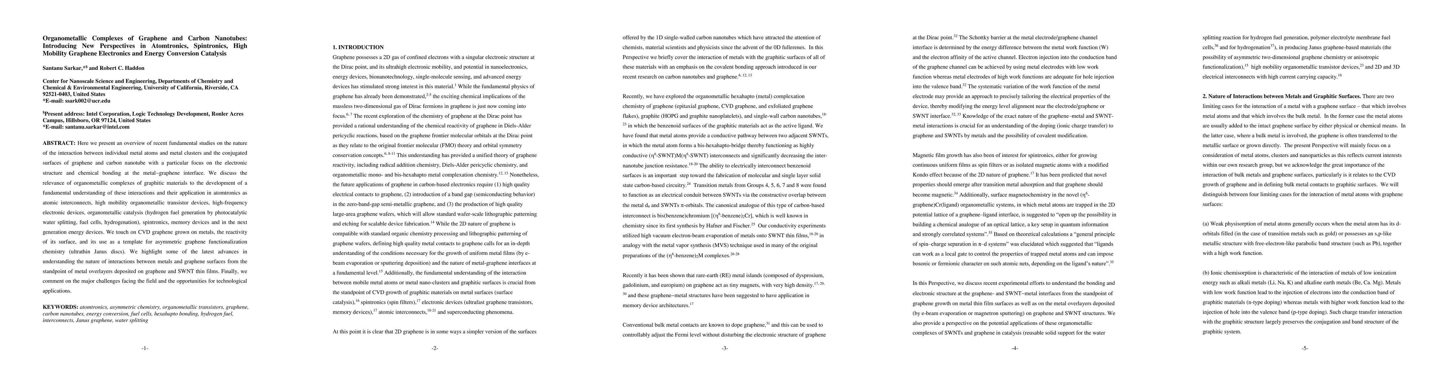 Here we present an overview of recent fundamental studies on the nature of the interaction between individual metal atoms and metal clusters and the conjugated surfaces of graphene and carbon nanotube with a particular focus on the electronic structure and chemical bonding at the metal-graphene interface. We discuss the relevance of organometallic complexes of graphitic materials to the development of a fundamental understanding of these interactions and their application in atomtronics as atomic interconnects, high mobility organometallic transistor devices, high-frequency electronic devices, organometallic catalysis (hydrogen fuel generation by photocatalytic water splitting, fuel cells, hydrogenation), spintronics, memory devices and in the next generation energy devices. We touch on CVD graphene grown on metals, the reactivity of its surface, and its use as a template for asymmetric graphene functionalization chemistry (ultrathin Janus discs). We highlight some of the latest advances in understanding the nature of interactions between metals and graphene surfaces from the standpoint of metal overlayers deposited on graphene and SWNT thin films. Finally, we comment on the major challenges facing the field and the opportunities for technological applications.