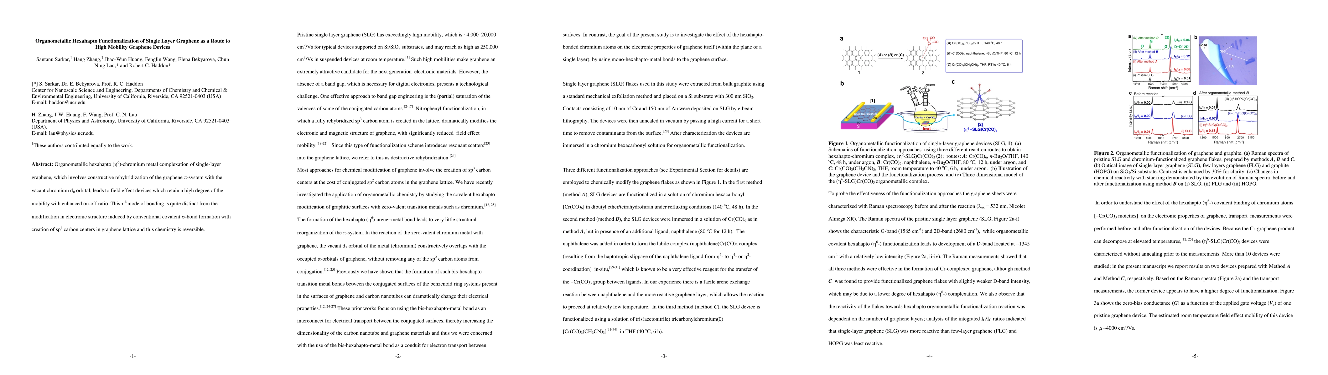 Organometallic hexahapto chromium metal complexation of single layer graphene, which involves constructive rehybridization of the graphene pi-system with the vacant chromium d orbital, leads to field effect devices which retain a high degree of the mobility with enhanced on-off ratio. This hexahapto mode of bonding between metal and graphene is quite distinct from the modification in electronic structure induced by conventional covalent sigma-bond formation with creation of sp3 carbon centers in graphene lattice and this chemistry is reversible.