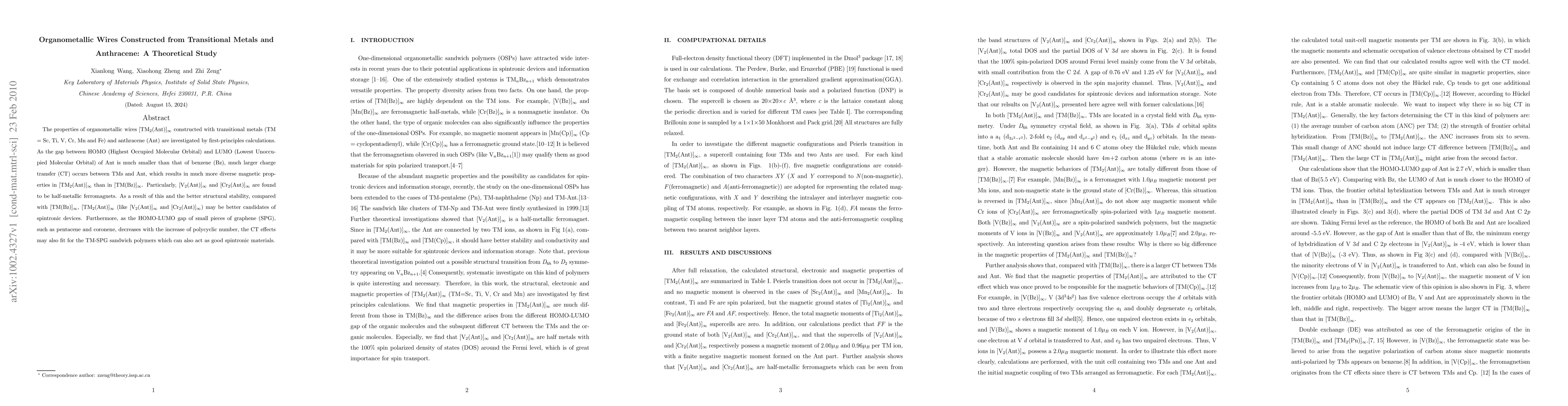 The properties of organometallic wires [TM2(Ant)] constructed with transitional metals (TM = Sc, Ti, V, Cr, Mn and Fe) and anthracene (Ant) are investigated by first-principles calculations. As the gap between HOMO (Highest Occupied Molecular Orbital) and LUMO (Lowest Unoccupied Molecular Orbital) of Ant is much smaller than that of benzene (Bz), much larger charge transfer (CT) occurs between TMs and Ant, which results in much more diverse magnetic properties in [TM2(Ant)] than in [TM2(Ant)]. Particularly, [V2(Ant)] and [Cr2(Ant)] are found to be half-metallic ferromagnets. As a result of this and the better structural stability, compared with [TM(Bz)], [TM2(Ant)] (like [V2(Ant)] and [Cr2(Ant)]) may be better candidates of spintronic devices. Furthermore, as the HOMO-LUMO gap of small pieces of graphene (SPG), such as pentacene and coronene, decreases with the increase of polycyclic number, the CT effects may also fit for the TM-SPG sandwich polymers which can also act as good spintronic materials.