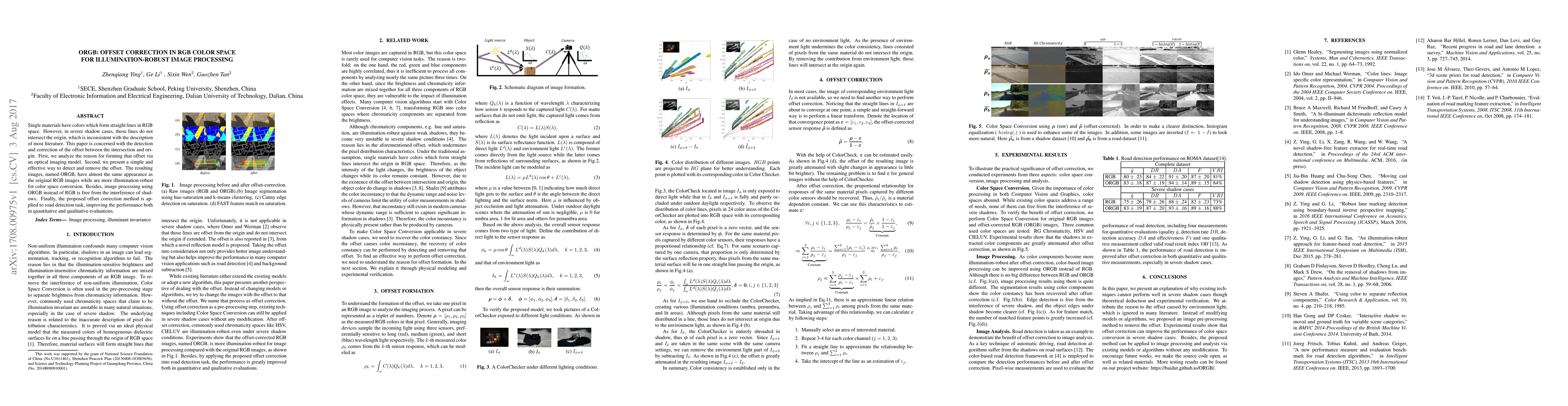 This paper proposes an offset correction method, ORGB, to address the issue of shadows causing color lines in RGB space to deviate from the origin. It introduces a technique to detect and correct this offset, enhancing illumination-robustness and improving color space conversion and shadow-free image processing. The method is demonstrated to improve road detection performance.