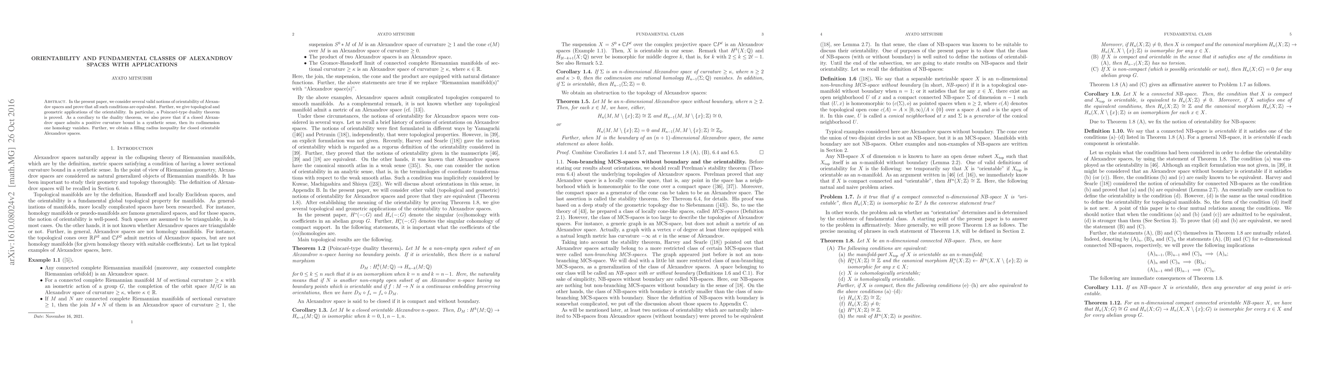 This research establishes equivalence among various orientability notions for Alexandrov spaces, proving a Poincaré-type duality theorem. It further demonstrates that closed Alexandrov spaces with positive curvature bounds have vanishing codimension one homology. Additionally, a filling radius inequality is derived for closed orientable Alexandrov spaces.