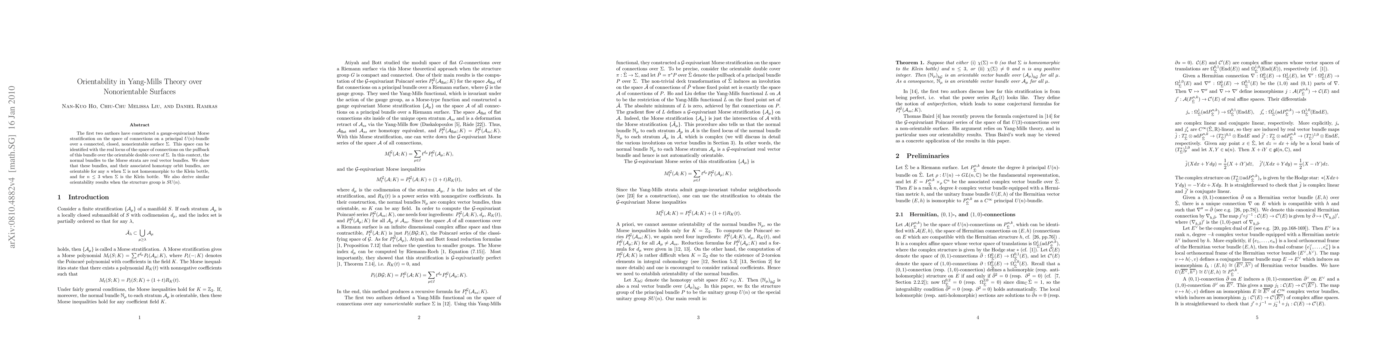 This paper constructs a Morse stratification on the space of connections over nonorientable surfaces, identifying it with the real locus over the orientable double cover. The normal bundles to these strata are shown to be orientable except for specific cases involving the Klein bottle and n ≥ 4. Similar results are obtained for the structure group SU(n).