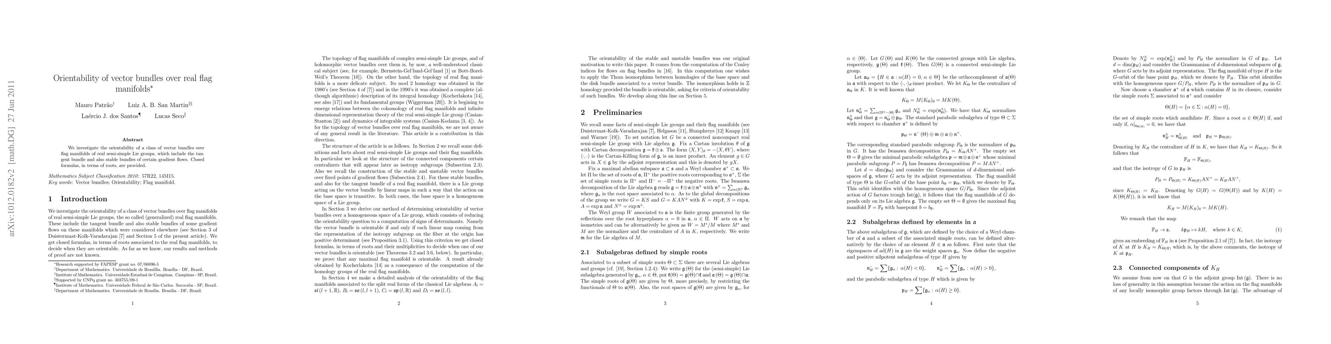 This paper explores the orientability of vector bundles over real flag manifolds associated with semi-simple Lie groups, providing closed formulas for the condition in terms of the roots of the group. The study includes the tangent bundle and stable bundles from specific gradient flows.