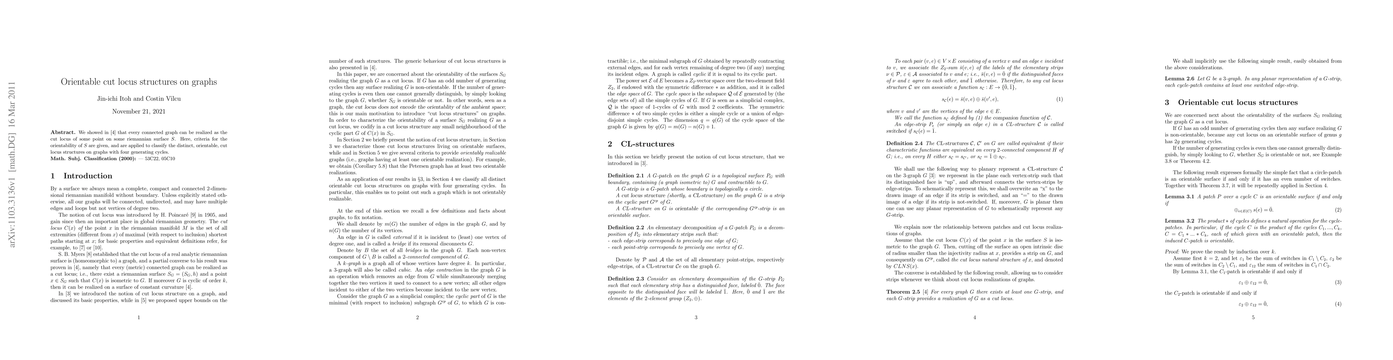 We showed in another paper [arXiv:1103.1759] that every connected graph can be realized as the cut locus of some point on some riemannian surface $S$. Here, criteria for the orientability of $S$ are given, and are applied to classify the distinct, orientable, cut locus structures on graphs with four generating cycles.