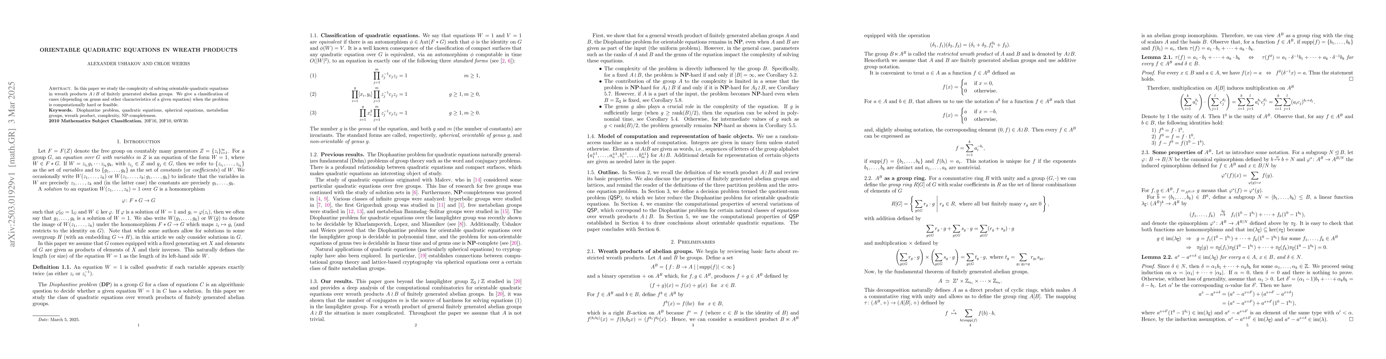 This paper classifies the complexity of solving orientable quadratic equations in wreath products of finitely generated abelian groups, determining when the problem is computationally hard or feasible based on the equation's genus and other characteristics.