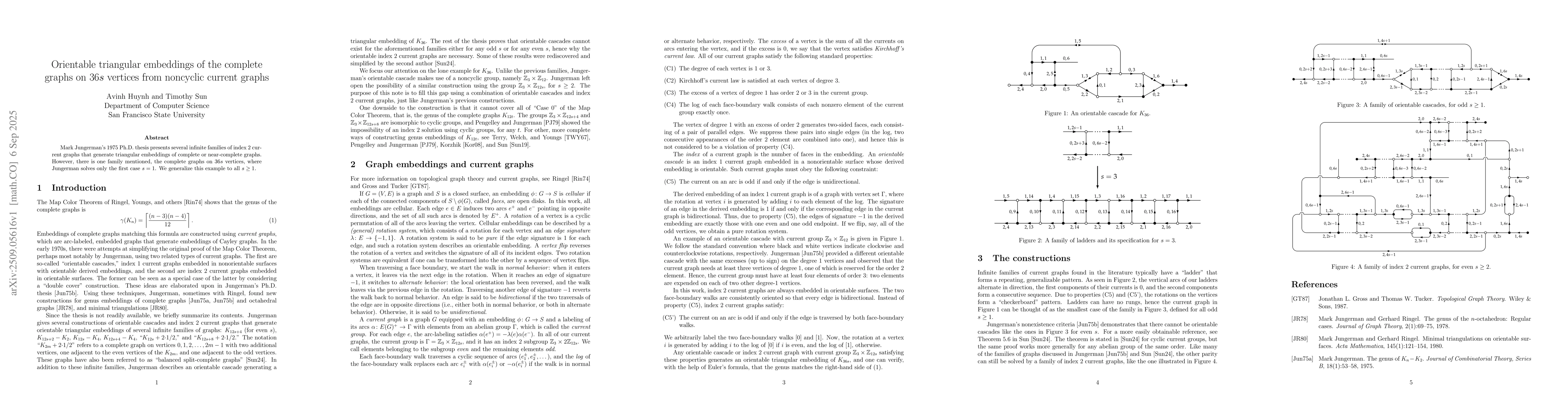 Mark Jungerman's 1975 Ph.D. thesis presents several infinite families of index 2 current graphs that generate triangular embeddings of complete or near-complete graphs. However, there is one family mentioned, the complete graphs on $36s$ vertices, where Jungerman solves only the first case $s = 1$. We generalize this example to all $s \geq 1$.