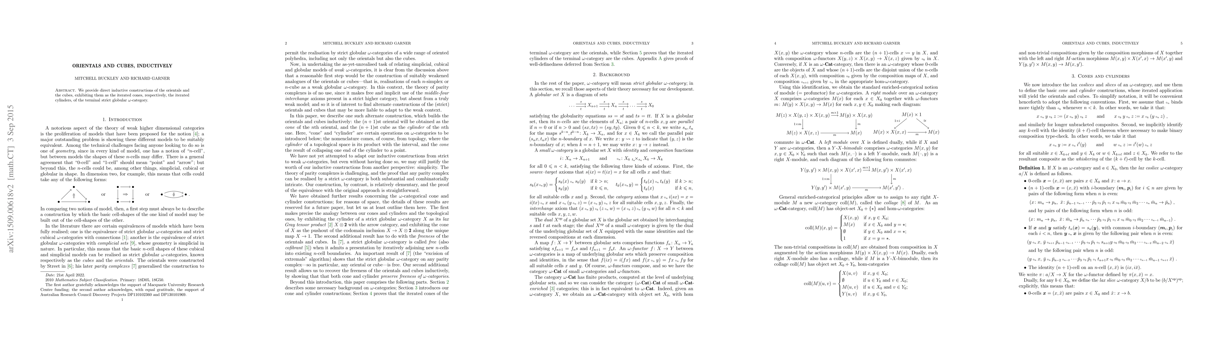We provide direct inductive constructions of the orientals and the cubes, exhibiting them as the iterated cones, respectively, the iterated cylinders, of the terminal strict globular omega-category.