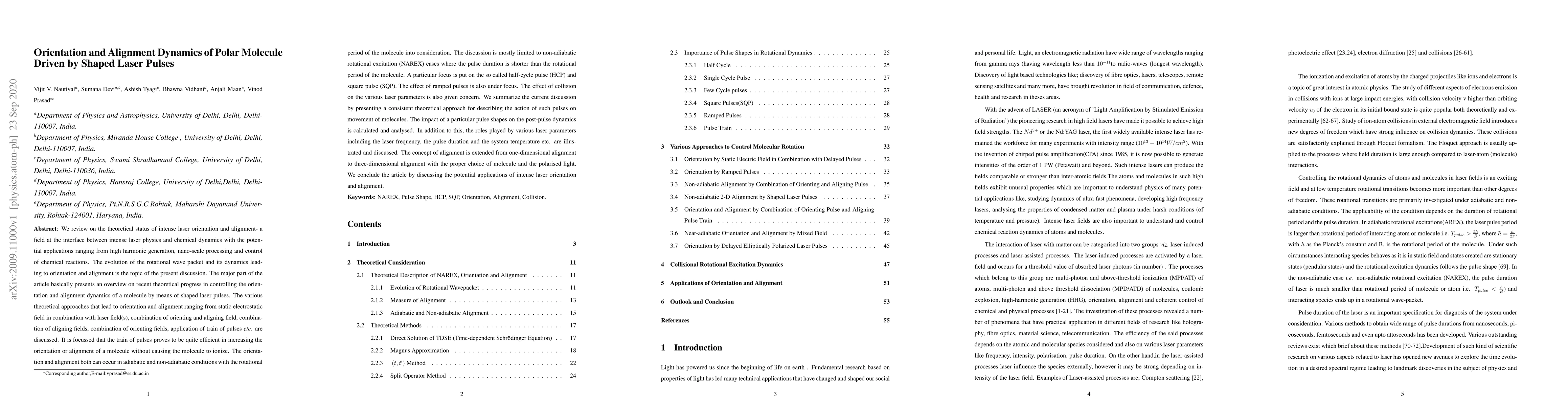 The research reviews the theoretical progress in controlling molecular orientation and alignment dynamics using shaped laser pulses, focusing on non-adiabatic rotational excitation (NAREX) and various pulse shapes like half-cycle pulse (HCP), square pulse (SQP), and ramped pulses.