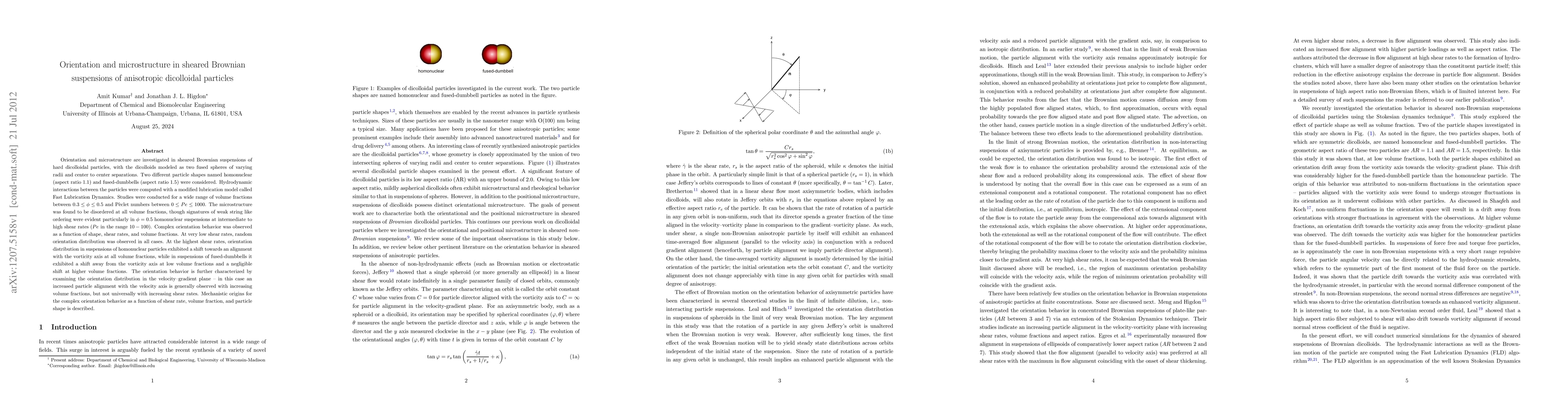 This study investigates the orientation and microstructure of sheared suspensions of anisotropic dicolloidal particles modeled as fused spheres of different sizes, focusing on homonuclear and fused-dumbbell shapes. The research reveals complex orientation behaviors influenced by particle shape, shear rates, and volume fractions, with notable shifts in orientation towards or away from the vorticity axis depending on these factors.