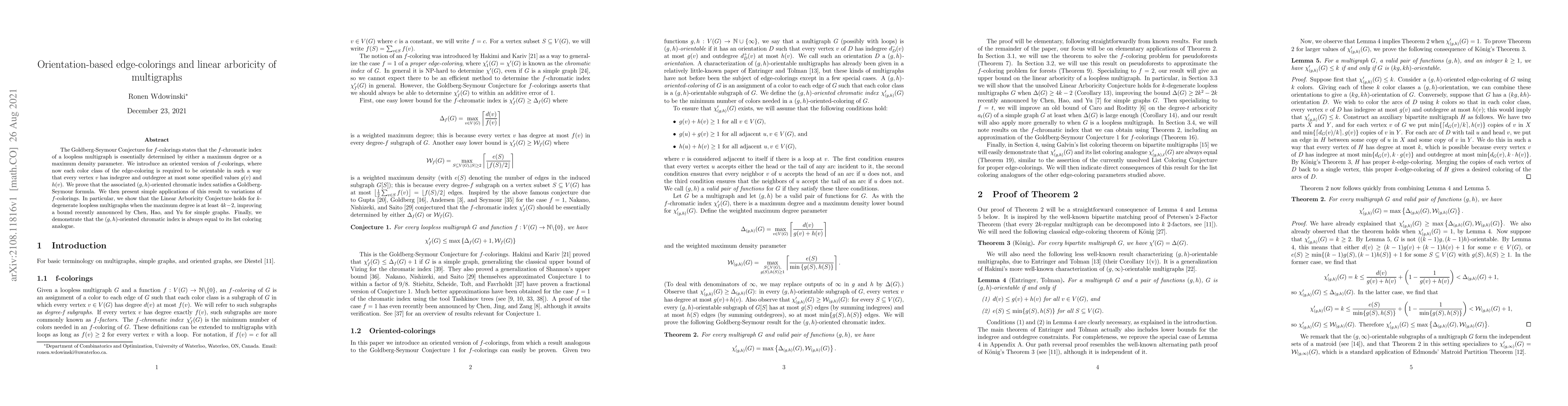 This paper proposes an oriented version of $f$-colorings, where each color class must be orientable with specified indegree and outdegree constraints. The authors prove a Goldberg-Seymour formula for this $(g,h)$-oriented chromatic index and apply it to prove the Linear Arboricity Conjecture for $k$-degenerate loopless multigraphs.