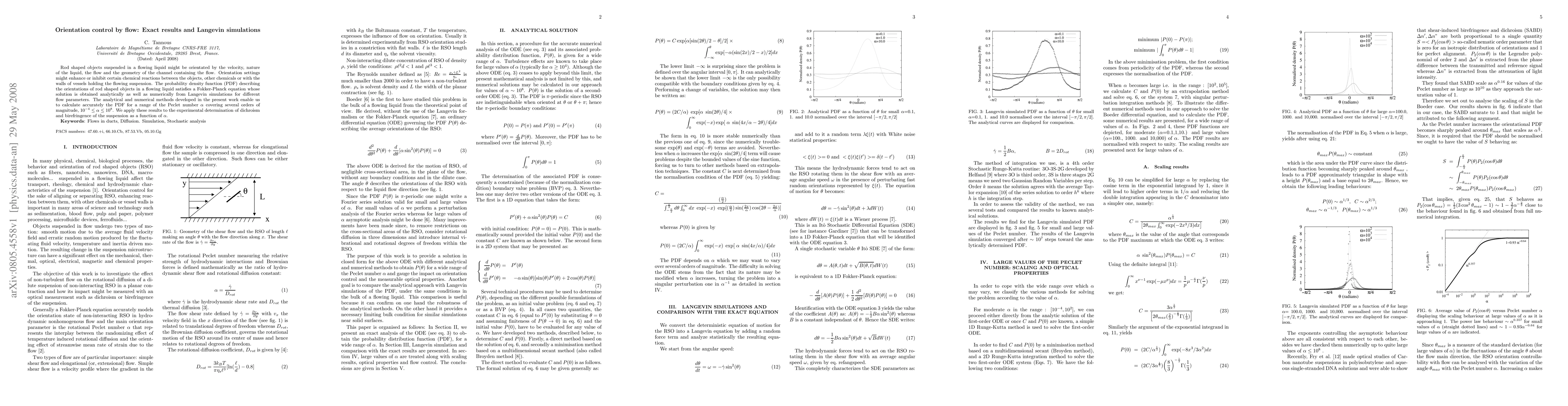Rod shaped objects suspended in a flowing liquid might be orientated by the velocity, nature of the liquid, the flow and the geometry of the channel containing the flow. Orientation settings might enhance or inhibit certain chemical reactions between the objects, other chemicals or with the walls of vessels holding the flowing suspension. The probability density function (PDF) describing the orientations of rod shaped objects in a flowing liquid satisfies a Fokker-Planck equation whose solution is obtained analytically as well as numerically from Langevin simulations for different flow parameters. The analytical and numerical methods developed in the present work enable us to calculate accurately the PDF for a range of the Peclet number $\alpha$ covering several orders of magnitude, $10^{-4} \le \alpha \le 10^{8}$. We apply these results to the experimental determination of dichroism and birefringence of the suspension as a function of $\alpha$.