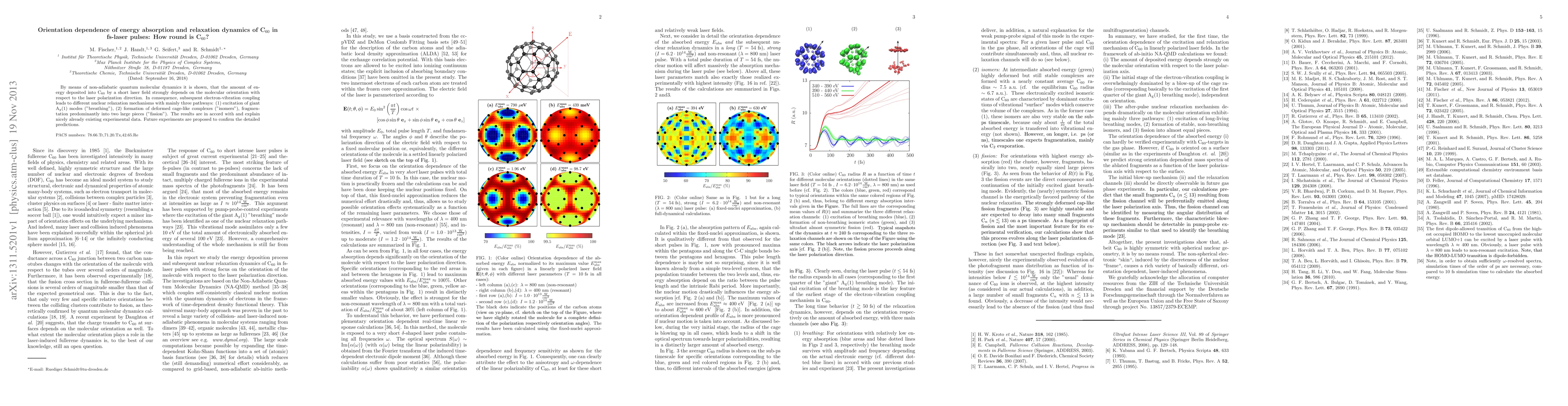 By means of non-adiabatic quantum molecular dynamics it is shown, that the amount of energy deposited into $\text{C}_{60}$ by a short laser field strongly depends on the molecular orientation with respect to the laser polarization direction. In consequence, subsequent electron-vibration coupling leads to different nuclear relaxation mechanisms with mainly three pathways: (1) excitation of giant $\text{A}_g(1)$ modes ("breathing"), (2) formation of deformed cage-like complexes ("isomers"), fragmentation predominantly into two large pieces ("fission"). The results are in accord with and explain nicely already existing experimental data. Future experiments are proposed to confirm the detailed predictions.