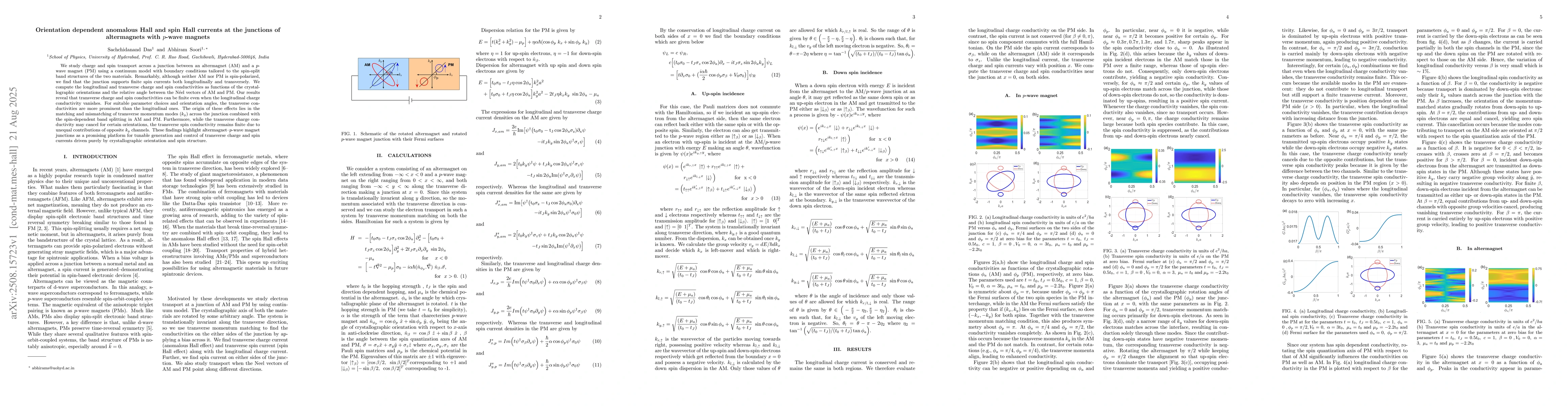 We study charge and spin transport across a junction between an altermagnet (AM) and a $p$-wave magnet (PM) using a continuum model with boundary conditions tailored to the spin-split band structures of the two materials. Remarkably, although neither AM nor PM is spin-polarized, we find that the junction supports finite spin currents both longitudinally and transversely. We compute the longitudinal and transverse charge and spin conductivities as functions of the crystallographic orientations and the relative angle between the N\'eel vectors of AM and PM. Our results reveal that transverse charge and spin conductivities can be finite even when the longitudinal charge conductivity vanishes. For suitable parameter choices and orientation angles, the transverse conductivities are more prominent than the longitudinal ones. The origin of these effects lies in the matching and mismatching of transverse momentum modes ($k_y$) across the junction combined with the spin-dependent band splitting in AM and PM. Furthermore, while the transverse charge conductivity may cancel for certain orientations, the transverse spin conductivity remains finite due to unequal contributions of opposite $k_y$ channels. These findings highlight altermagnet/$p$-wave magnet junctions as a promising platform for tunable generation and control of transverse charge and spin currents driven purely by crystallographic orientation and spin structure.