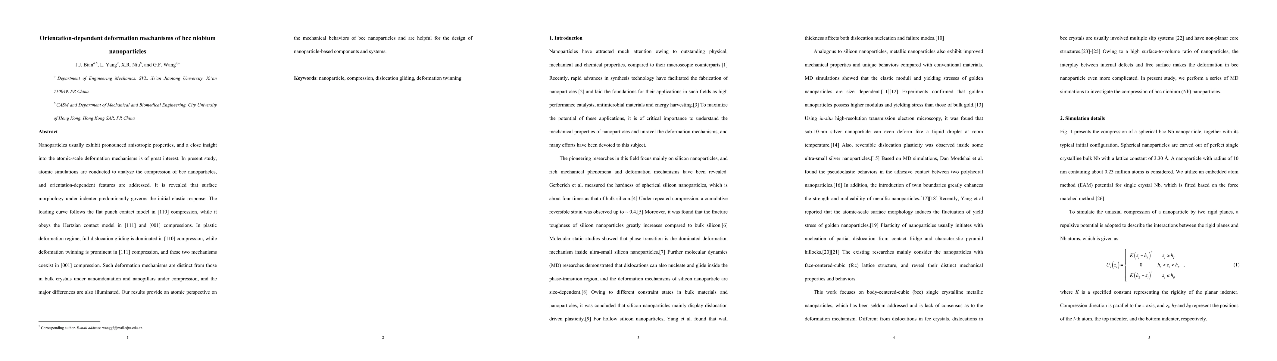 Nanoparticles usually exhibit pronounced anisotropic properties, and a close insight into the atomic-scale deformation mechanisms is of great interest. In present study, atomic simulations are conducted to analyze the compression of bcc nanoparticles, and orientation-dependent features are addressed. It is revealed that surface morphology under indenter predominantly governs the initial elastic response. The loading curve follows the flat punch contact model in [110] compression, while it obeys the Hertzian contact model in [111] and [001] compressions. In plastic deformation regime, full dislocation gliding is dominated in [110] compression, while deformation twinning is prominent in [111] compression, and these two mechanisms coexist in [001] compression. Such deformation mechanisms are distinct from those in bulk crystals under nanoindentation and nanopillars under compression, and the major differences are also illuminated. Our results provide an atomic perspective on the mechanical behaviors of bcc nanoparticles and are helpful for the design of nanoparticle-based components and systems.
