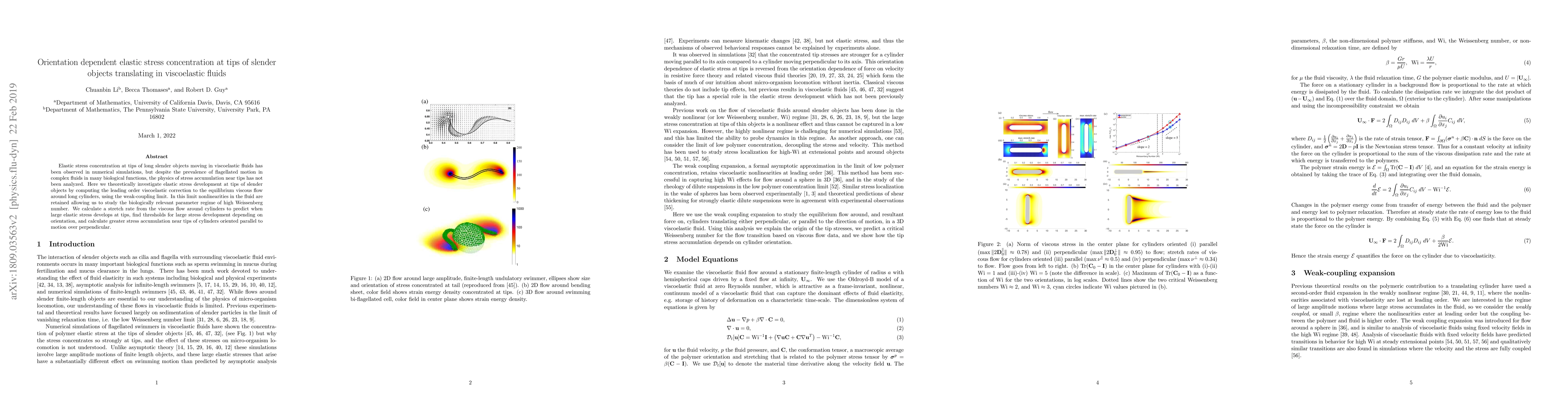 This paper theoretically analyzes elastic stress concentration at the tips of slender objects translating in viscoelastic fluids, revealing that stress development depends on the orientation of the object relative to its motion. The study identifies thresholds for significant stress accumulation, showing greater stress for objects aligned parallel to motion compared to perpendicular orientation.