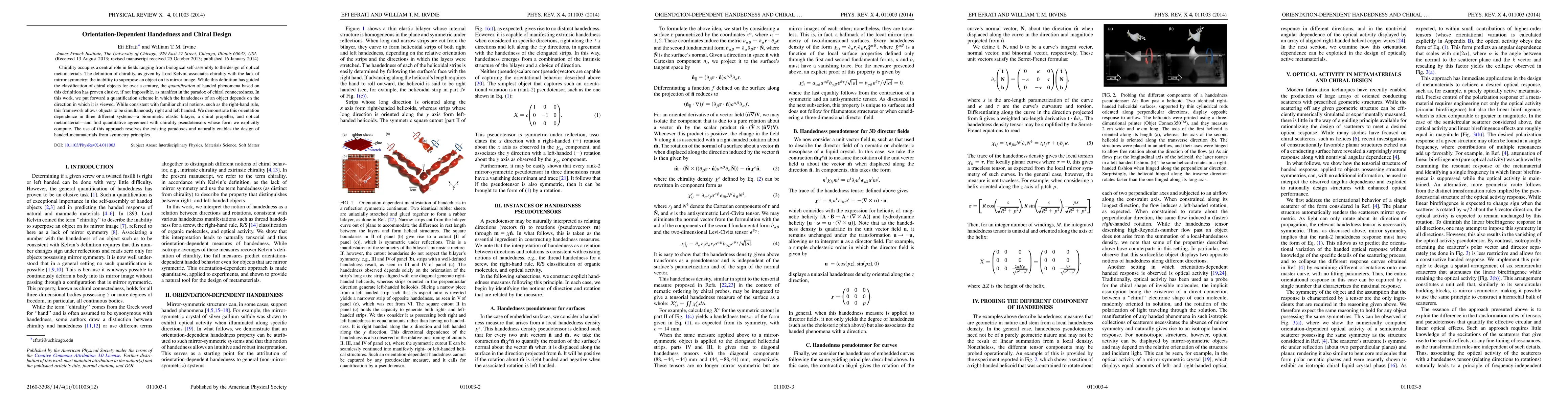 Chirality occupies a central role in fields ranging from biological self-assembly to the design of optical metamaterials. The definition of chirality, as given by Lord Kelvin, associates chirality with the lack of mirror symmetry: the inability to superpose an object on its mirror image. While this definition has guided the classification of chiral objects for over a century, the quantification of handed phenomena based on this definition has proven elusive, if not impossible, as manifest in the paradox of chiral connectedness. In this work, we put forward a quantification scheme in which the handedness of an object depends on the direction in which it is viewed. While consistent with familiar chiral notions, such as the right-hand rule, this framework allows objects to be simultaneously right and left handed. We demonstrate this orientation dependence in three different systems - a biomimetic elastic bilayer, a chiral propeller, and optical metamaterial - and find quantitative agreement with chirality pseudotensors whose form we explicitly compute. The use of this approach resolves the existing paradoxes and naturally enables the design of handed metamaterials from symmetry principles.
