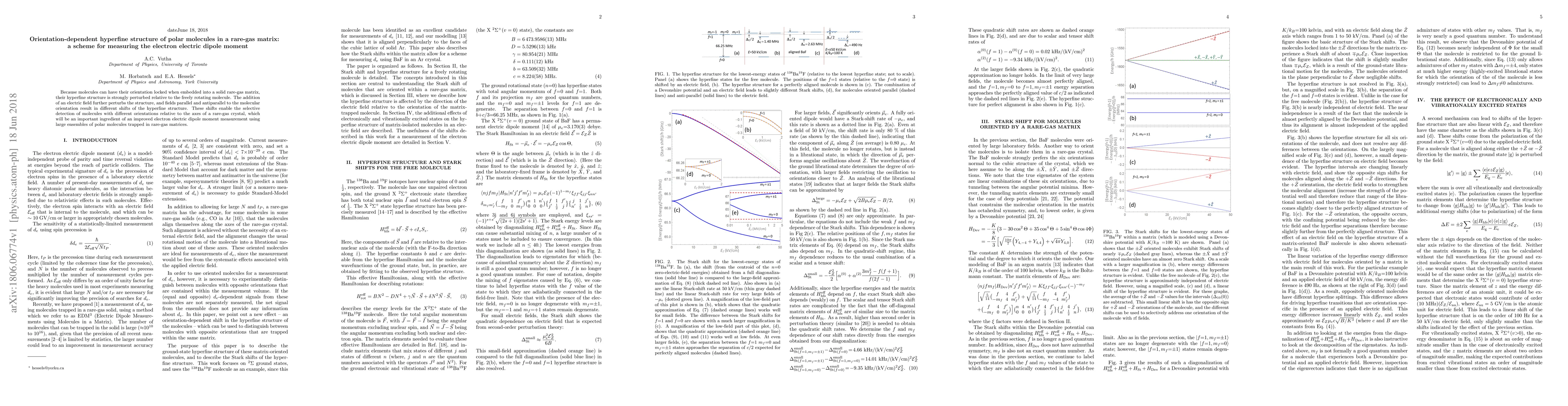 Because molecules can have their orientation locked when embedded into a solid rare-gas matrix, their hyperfine structure is strongly perturbed relative to the freely rotating molecule. The addition of an electric field further perturbs the structure, and fields parallel and antiparallel to the molecular orientation result in different shifts of the hyperfine structure. These shifts enable the selective detection of molecules with different orientations relative to the axes of a rare-gas crystal, which will be an important ingredient of an improved electron electric dipole moment measurement using large ensembles of polar molecules trapped in rare-gas matrices.