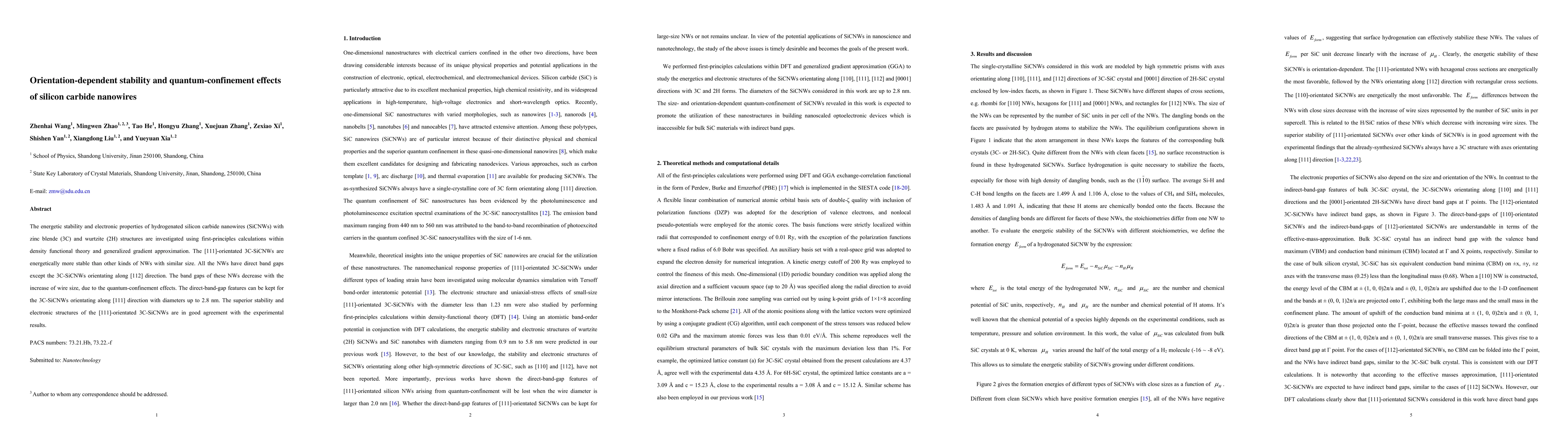 The energetic stability and electronic properties of hydrogenated silicon carbide nanowires (SiCNWs) with zinc blende (3C) and wurtzite (2H) structures are investigated using first-principles calculations within density functional theory and generalized gradient approximation. The [111]-orientated 3C-SiCNWs are energetically more stable than other kinds of NWs with similar size. All the NWs have direct band gaps except the 3C-SiCNWs orientating along [112] direction. The band gaps of these NWs decrease with the increase of wire size, due to the quantum-confinement effects. The direct-band-gap features can be kept for the 3C-SiCNWs orientating along [111] direction with diameters up to 2.8 nm. The superior stability and electronic structures of the [111]-orientated 3C-SiCNWs are in good agreement with the experimental results.