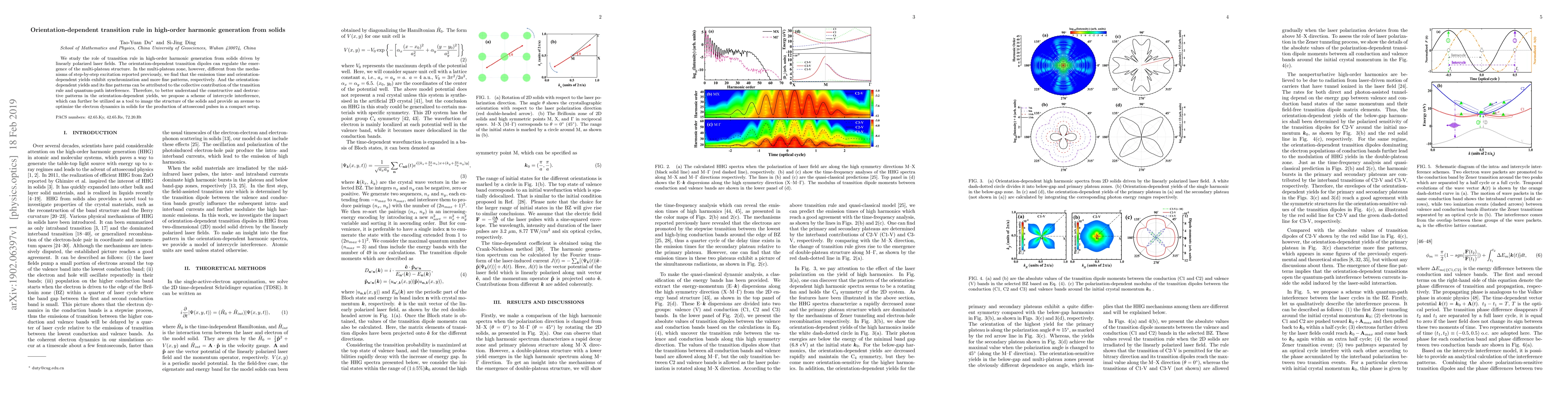 We study the role of transition rule in high-order harmonic generation from solids driven by linearly polarized laser elds. The orientation-dependent transition dipoles can regulate the emergence of the multi-plateau structure. In the multi-plateau zone, however, di erent from the mechanisms of step-by-step excitation reported previously, we nd that the emission time and orientationdependent yields exhibit synchronization and more ne patterns, respectively. And the orientationdependent yields and its ne patterns can be attributed to the collective contribution of the transition rule and quantum-path interference. Therefore, to better understand the constructive and destructive patterns in the orientation-dependent yields, we propose a scheme of intercycle interference, which can further be utilized as a tool to image the structure of the solids and provide an avenue to optimize the electron dynamics in solids for the production of attosecond pulses in a compact setup.